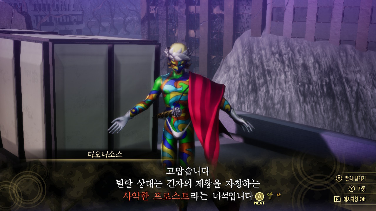 여기서 디오니소스 편을 들으면 로우 성향이, 사악한 프로스트 편을 들으면 카오스 성향이 증가합니다