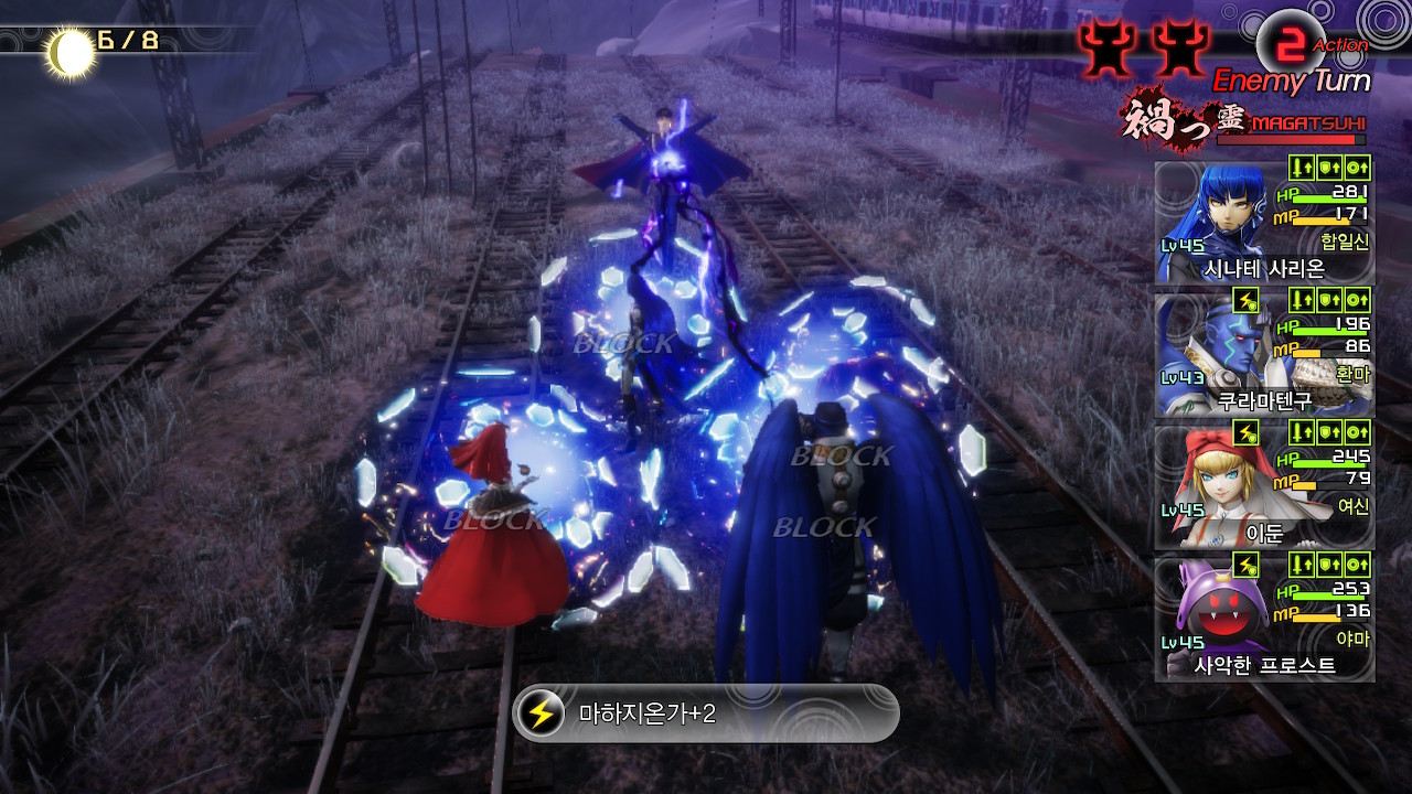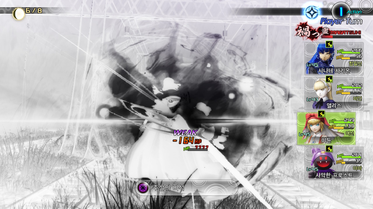 전투가 시작되면 1번 멤버는 마가츠히를 발동시키고, 버프 혹은 디버프 또는 만리의 안경을 적에게 씁니다. 주인공은 가장 빨리 잡을 수 있는 악마를 점사, 3번째 파티원은 처음에 때린 악마를 같이 점사합니다. 4번도 마찬가지. 보통 상대악마와 -3렙~+3렙 정도 차이가 난다면 첫턴에 하나의 악마를 빈사상태로 만들거나 퇴장시킬 수 있습니다. 이후에는 다시 다시 처음으로 돌아가서 루틴을 반복하고, 보스몹이 마가츠히를 쓴다면 해당 속성의 ~장석들로 막아주고 공격을 계속 이어나갑니다.