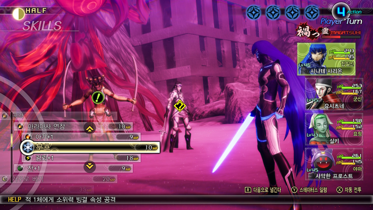 그런 장면을 보지 않으려면 기본적으로 야쿠모에게 디버프(공격력 디버프, 명중 회피 디버프)를 꾸준하게 걸어주시고, 아군에게는 방어력 강화 버프/명중 회피 버프를 걸어주세요. 그래도 전멸을 한다면 악마석, 마도서 등을 이용해서 아군의 깡능력치를 올려주고 다시 도전합시다.