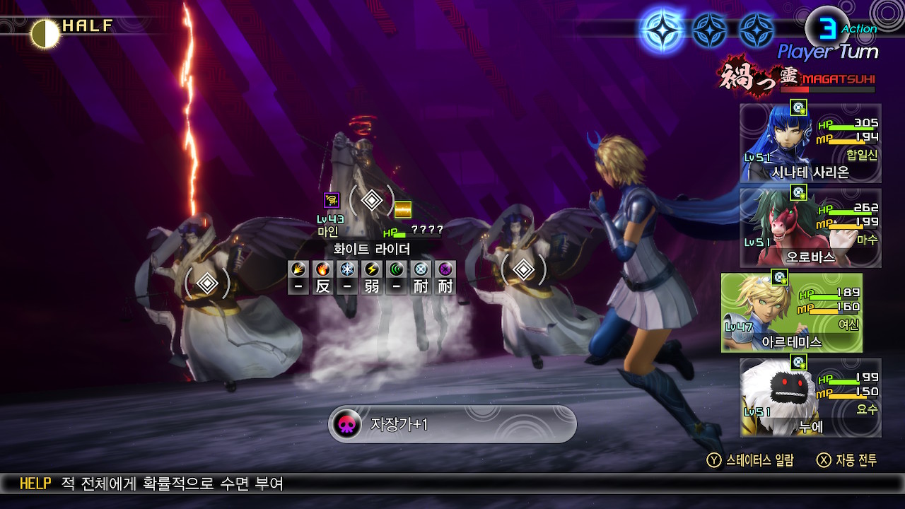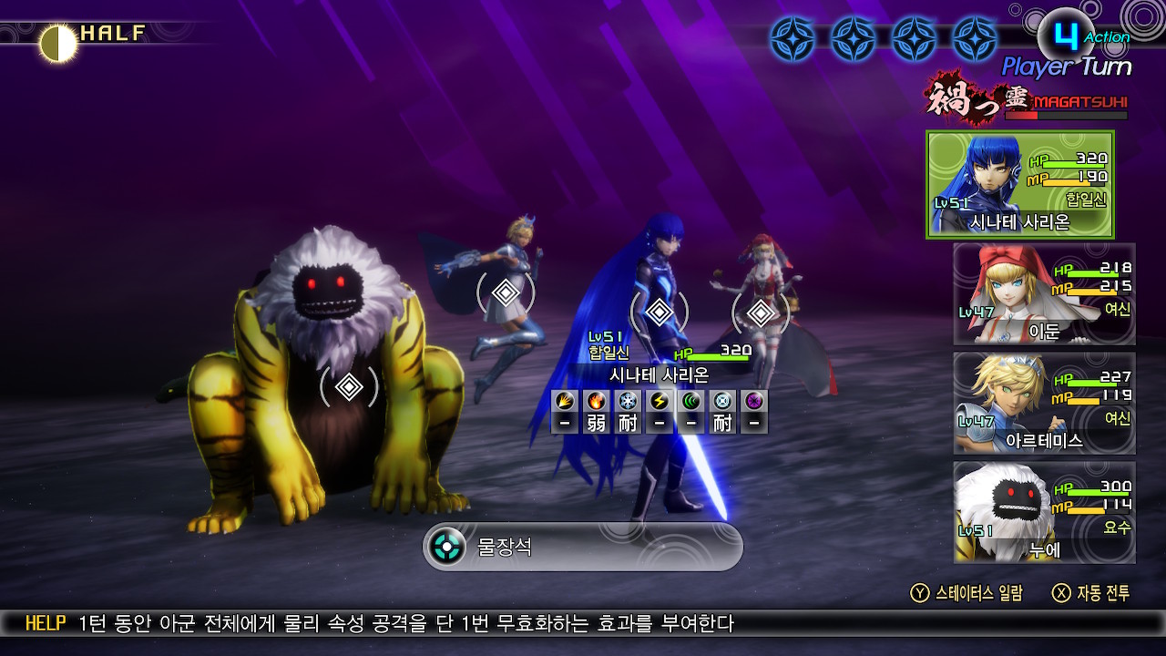 키마이라의 약점은 충격이고, 물리 공격 위주로 스킬을 쓰고, 마가츠히를 쓴 턴에는 마하라기온을 쓰니까 화장석으로 막아주세요