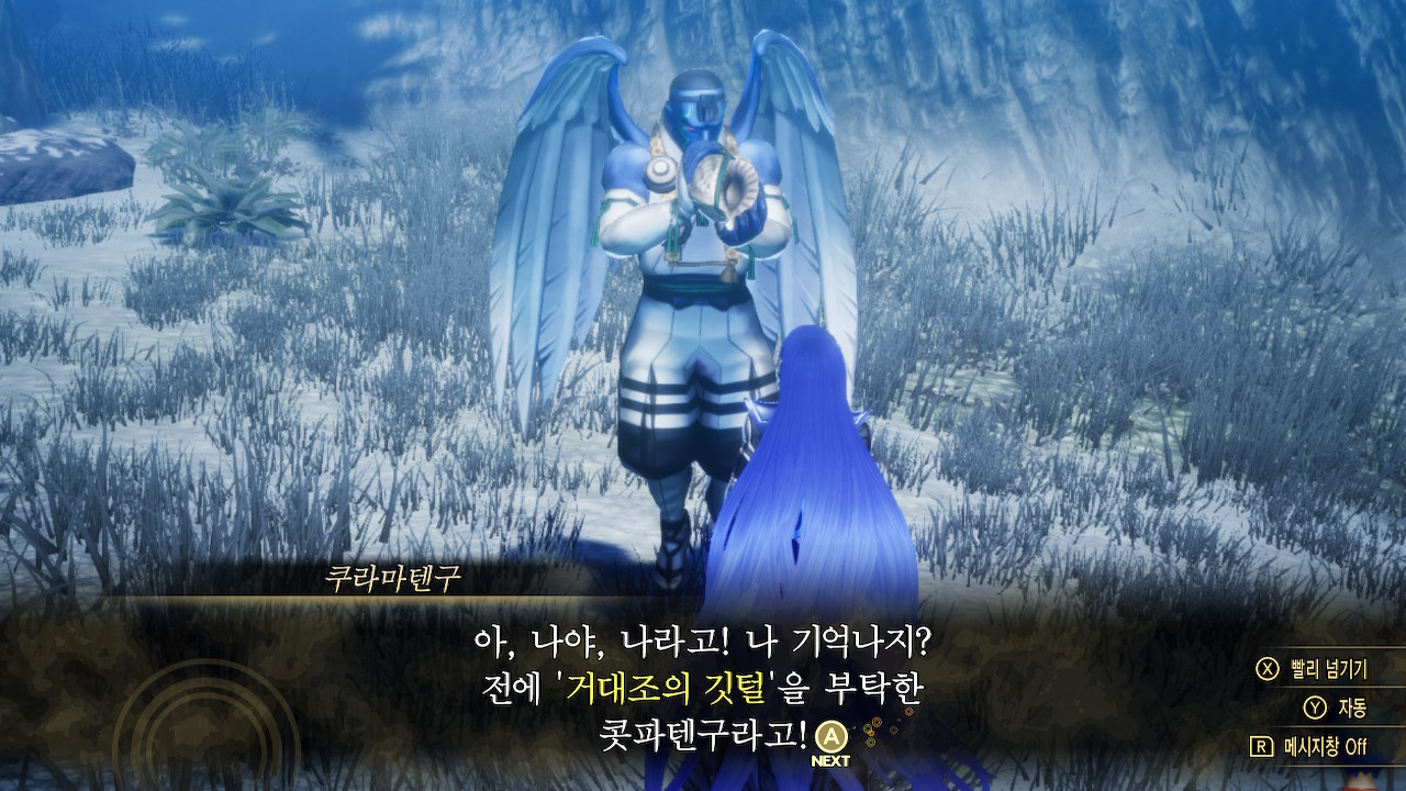 가서 말을 걸어보면, 예전에 깃털을 쌔벼달라고 부탁했던 그 텐구입니다. 너무 성장해버렸네요.