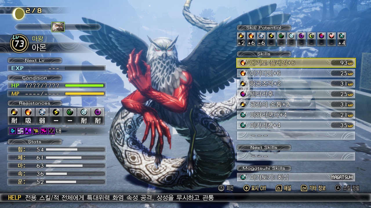 공격스킬들은 대부분 늘 봤던 그 스킬들인데, 메기도 플레임은 주의해야 합니다. 광역 관통 화염 마법이라 화염약점을 갖고 있는 악마가 아군에 있다면 개박살이 날 수 있어요.