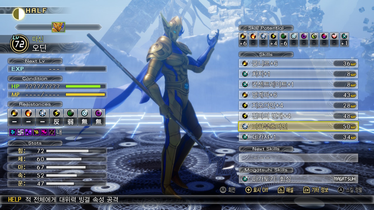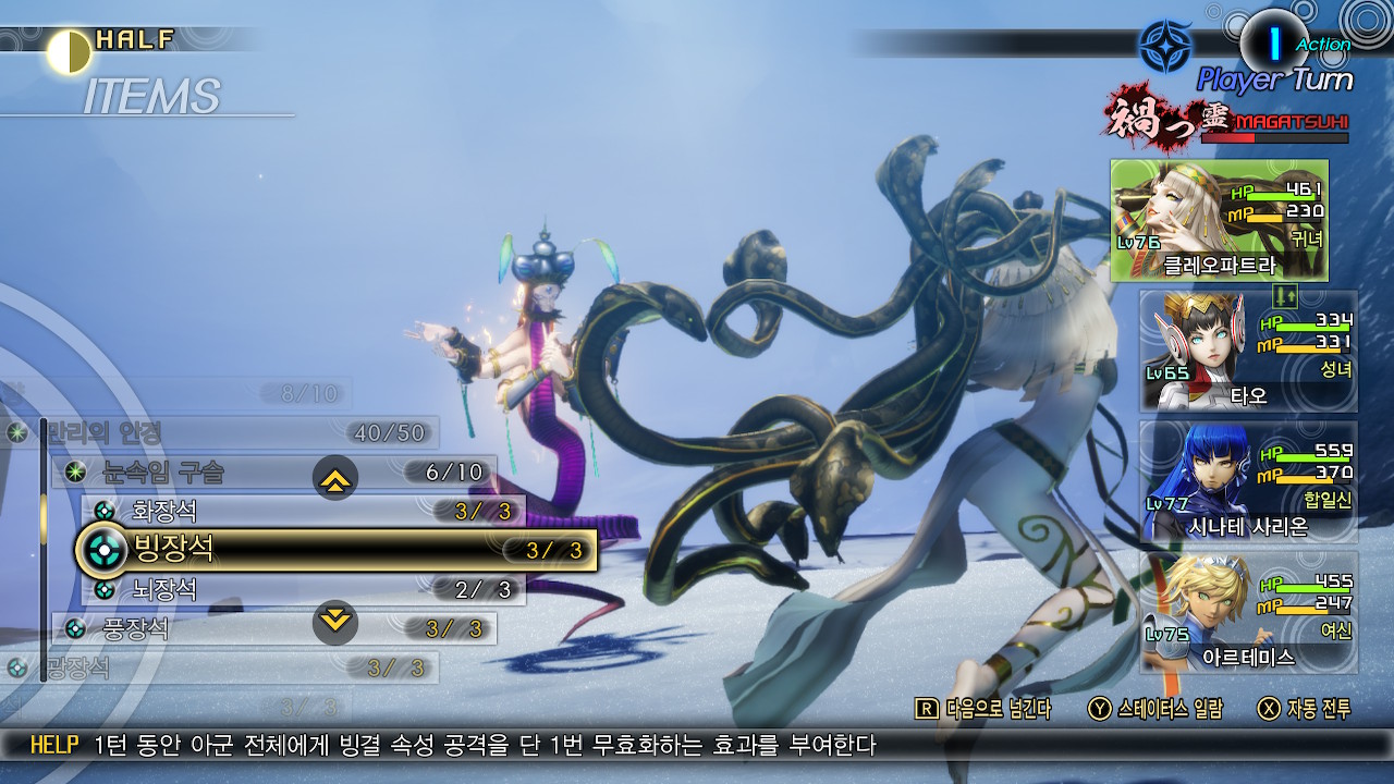 오딘이 마가츠히를 사용한 턴에는 빙장석을 사용해주세요. 보유 스킬 중에 데카자가 있어서 파티운용에 여유가 있다면 마나소모가 적은 버프를 아군전체에게 돌려서 데카쟈로 턴을 빼는게 유효할 수도 있습니다.