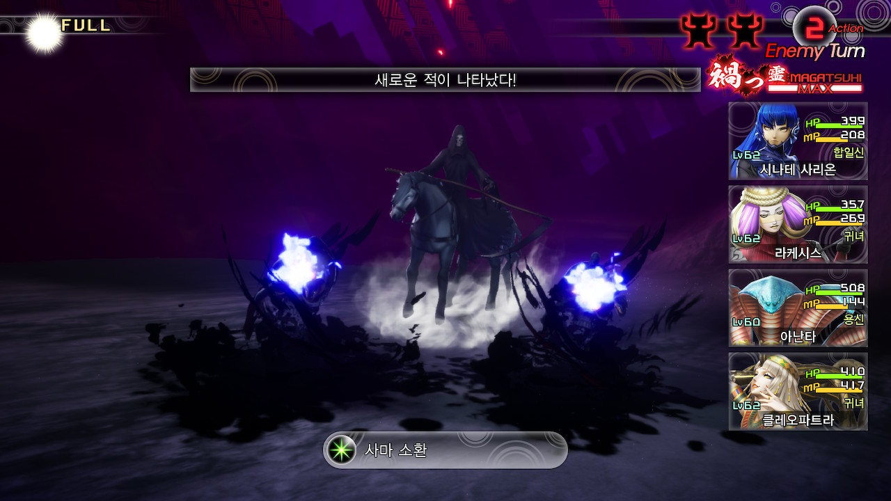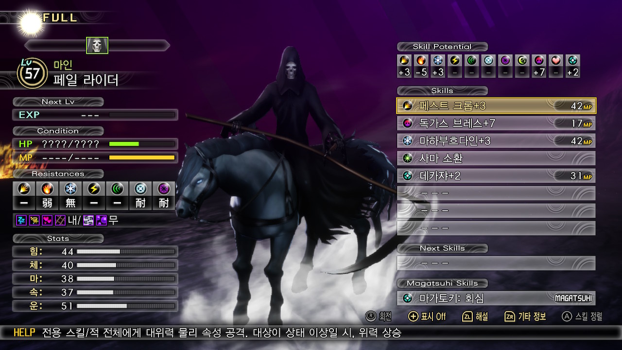 페일 라이더의 약점은 화염, 전체공격 위주의 스킬을 사용하는 악마입니다. 페일 라이더 자체는 별로 안무서운데, 사역마들이 사용하는 디버프가 위협적입니다.