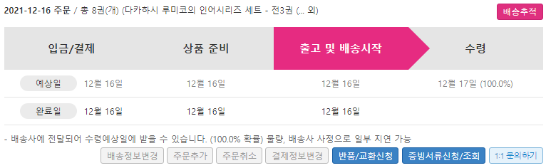 수령예상일은 항상 100%지만 배송사 사정으로 일부 지연 가능이라는 말부터 웃긴데, 요즘의 알라딘은 대놓고 확률로 장난을 치고 있다. 거의 50%확률(50.0% 확률, 배송사 사정으로 일부 당일 배송 가능)로 수령예상일을 맞추는 수준