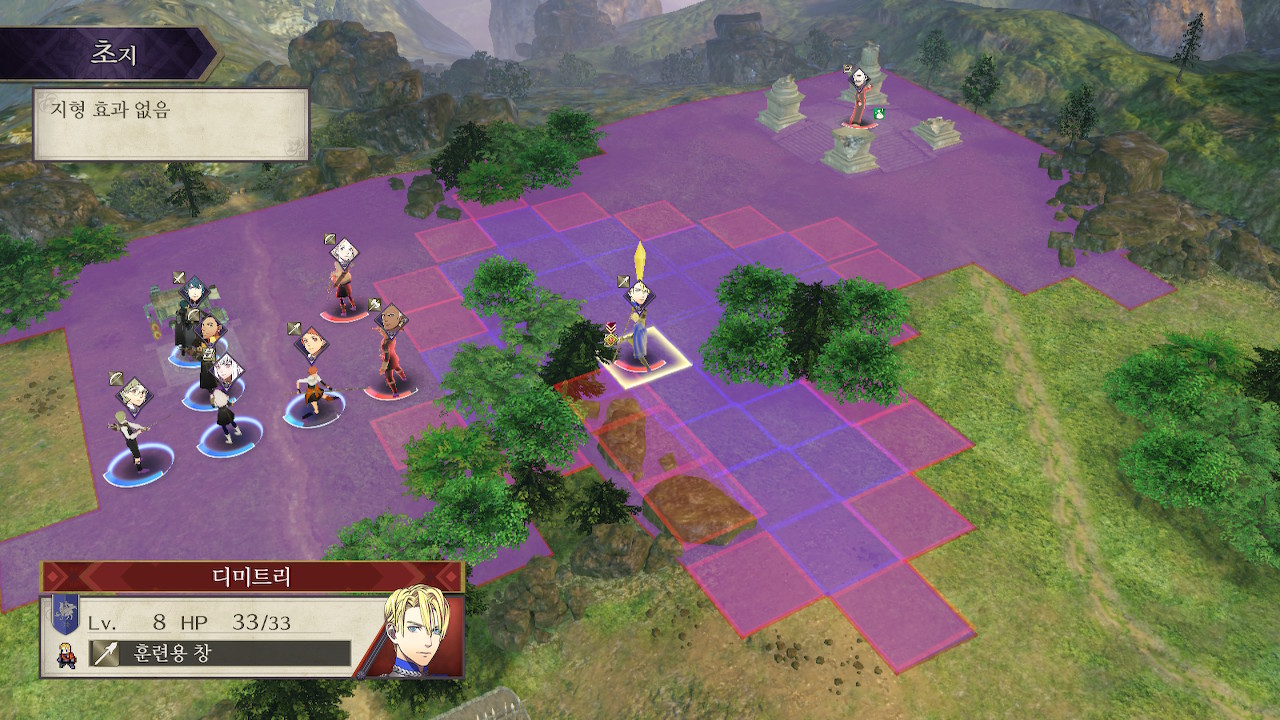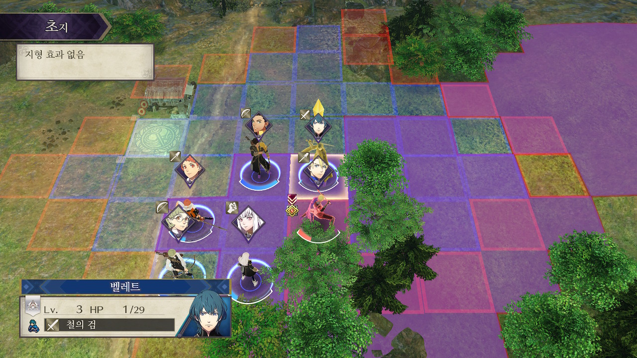 처음에 마주하게 되는 휴베르트와 페르디난트는 주인공을 근처 수풀에 배치하고, 나머지 멤버는 적의 사거리에 유의해서 안전지역에 배치하세요.