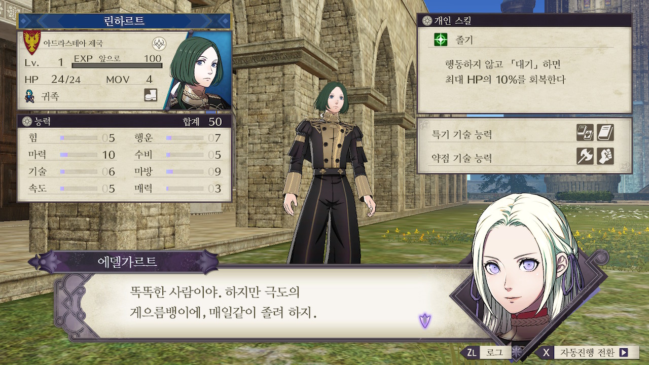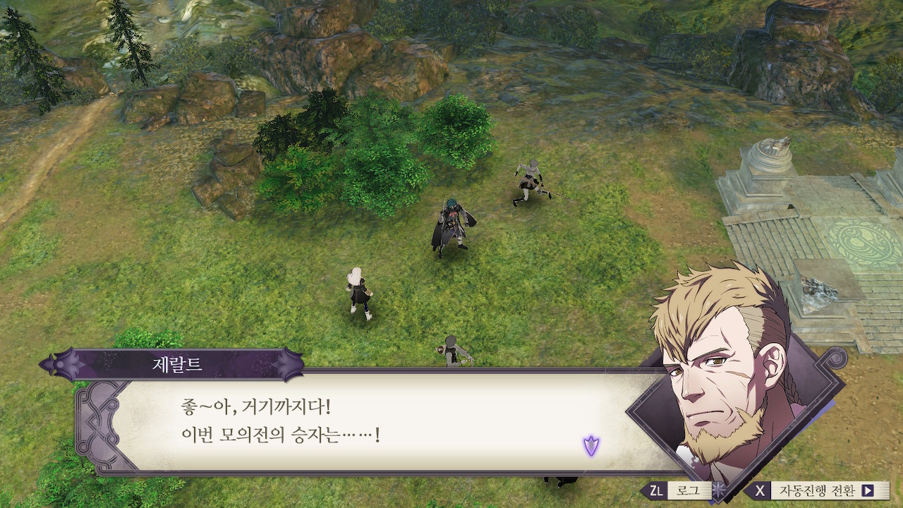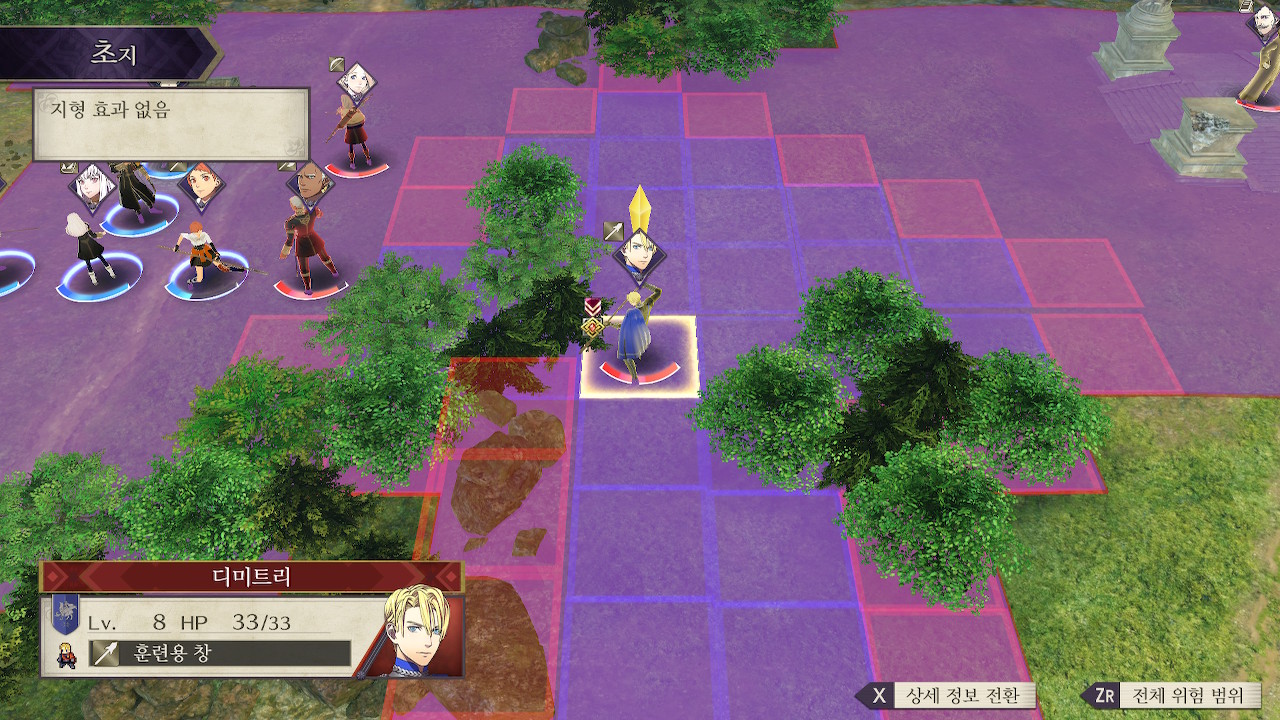 시작은 주인공을 수풀에 배치해서 어그로를 끌고(ZR을 누르면 적들의 위험지역을 확인할 수 있습니다), 적당히 다른반 반장들로 양념을 치고 클로드나 주인공으로 막타 경험치를 먹습니다.