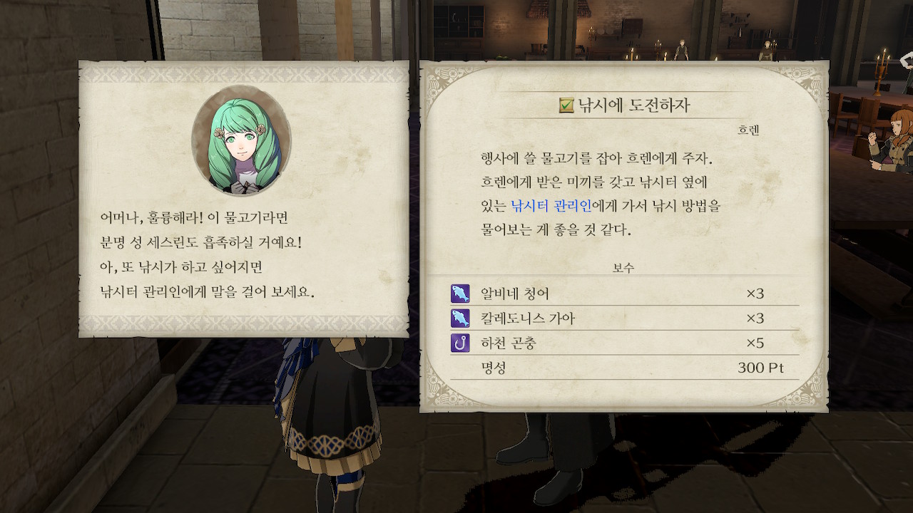 흐렌에게서 퀘스트를 받고, 밥을 먹고 난 후에는 식당 남쪽에서 낚시를 합시다.