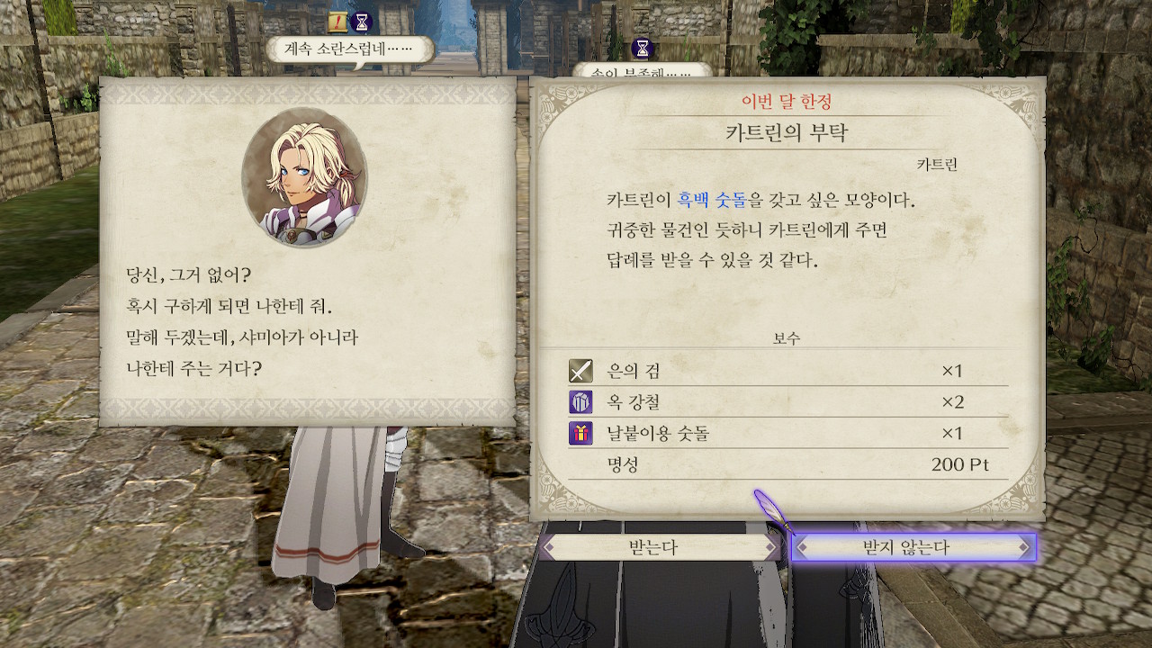 마굿간 근처에서 카트린과 샤미아가 말다툼을 하는걸 볼 수 있는데, 말을 걸면 퀘스트를 받을 수 있습니다.