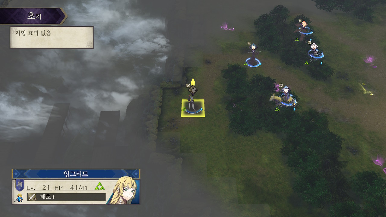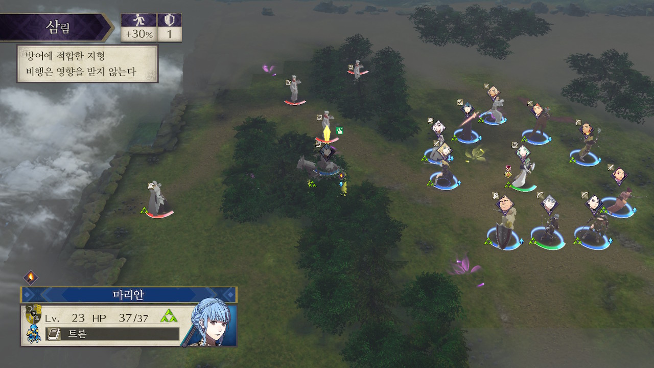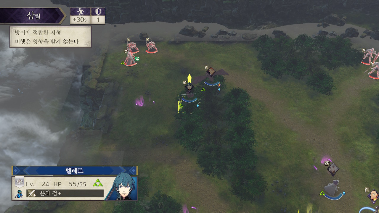 5시쪽은 창기병이 쏟아져서 창 킬러를 장착한 학생이나(예를 들어 도끼 드래곤 나이트 힐다), 나이트 헌터나 호스 킬러를 들고 있는 창병, 궁병등이 적절한데, 도끼녀는 사이좋게 한대씩 주고 받다가 죽을 수 있어서 위험하고, 맞창병은 이론상 좋아보이긴 하지만 저는 페르디난트 레벨이 딸려서 못썼습니다. 그래서 샤미아와 회피 로또를 노린 페트라를 투입했습니다. 페트라는 수풀 로또를 노려야 하는데, 재수가 없으면 한턴만에 죽습니다(...).