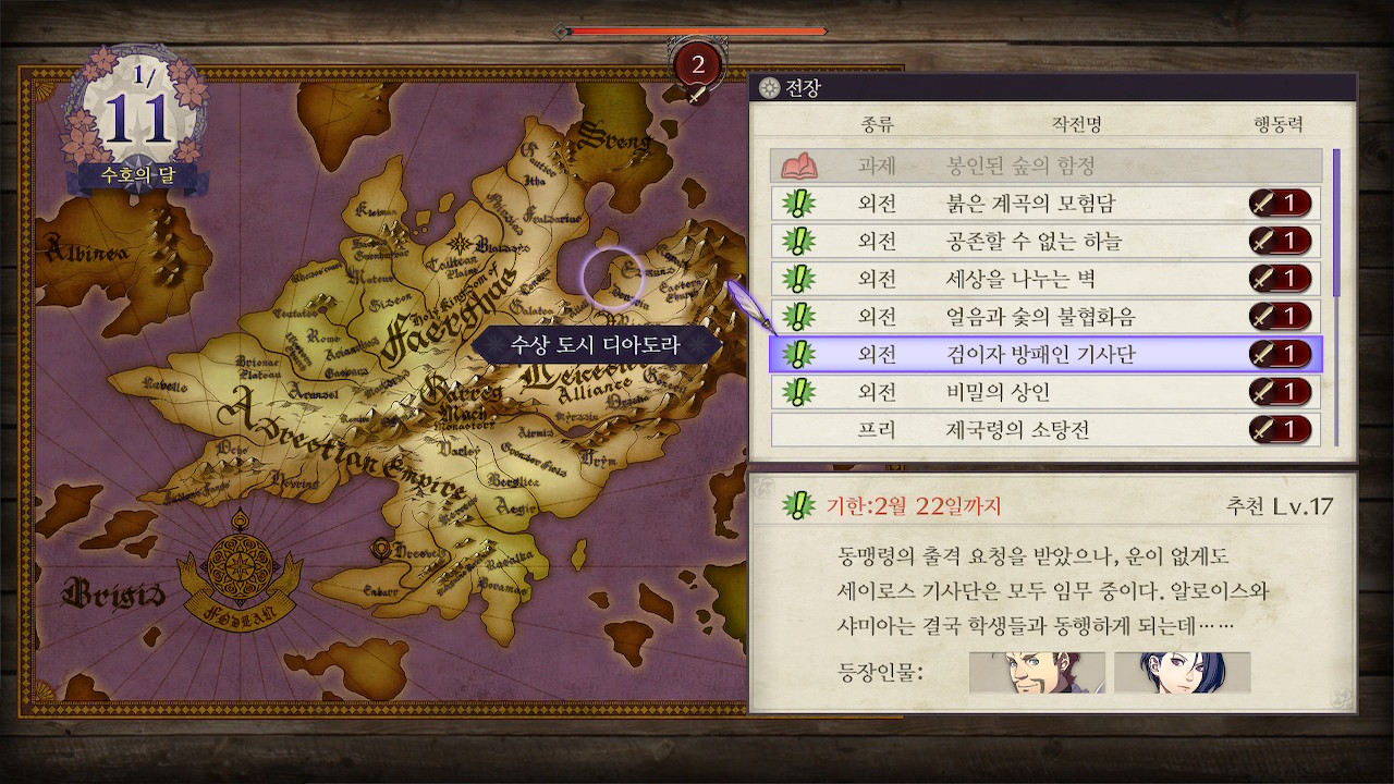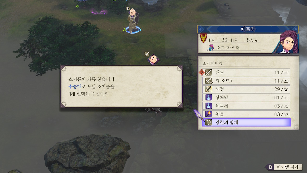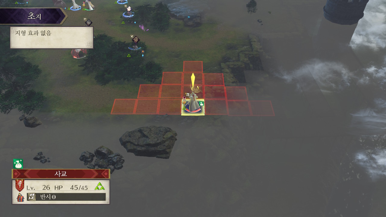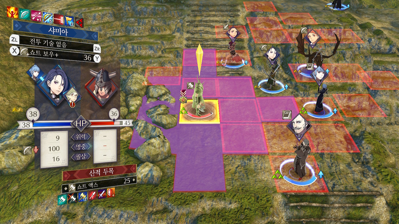 5시쪽은 창기병이 쏟아져서 창 킬러를 장착한 학생이나(예를 들어 도끼 드래곤 나이트 힐다), 나이트 헌터나 호스 킬러를 들고 있는 창병, 궁병등이 적절한데, 도끼녀는 사이좋게 한대씩 주고 받다가 죽을 수 있어서 위험하고, 맞창병은 이론상 좋아보이긴 하지만 저는 페르디난트 레벨이 딸려서 못썼습니다. 그래서 샤미아와 회피 로또를 노린 페트라를 투입했습니다. 페트라는 수풀 로또를 노려야 하는데, 재수가 없으면 한턴만에 죽습니다(...).
