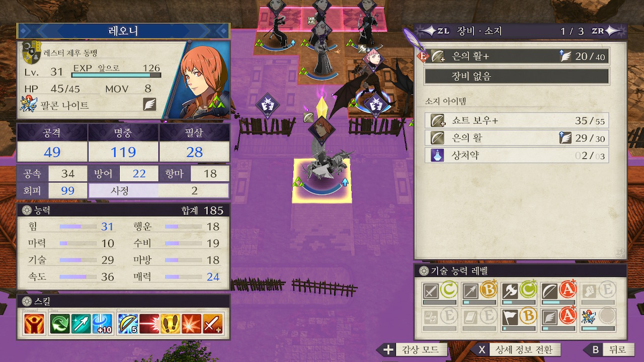 그래서 저는 학생 2명으로 번갈아가며 회피탱을 할 생각입니다. 경계태세+를 찍은 레오니(활은 일단 근거리 연사까지만 찍고 이후 비행은 계속, 검과 창은 팔콘 나이트 승급 용도로만 지도한 상태)와 경계 태세를 갖고 있는 잉그리트인데, 레오니는 잘커서 크게 걱정이 안되지만 잉그리트는 육성이 미완성이고, 적들과 렙차도 나서 최대 2명까지만 탱킹을 하겠습니다.
