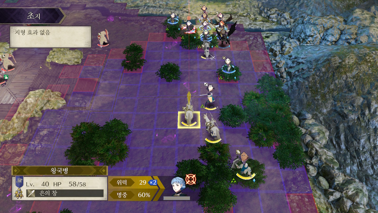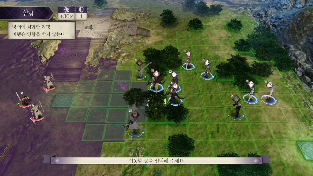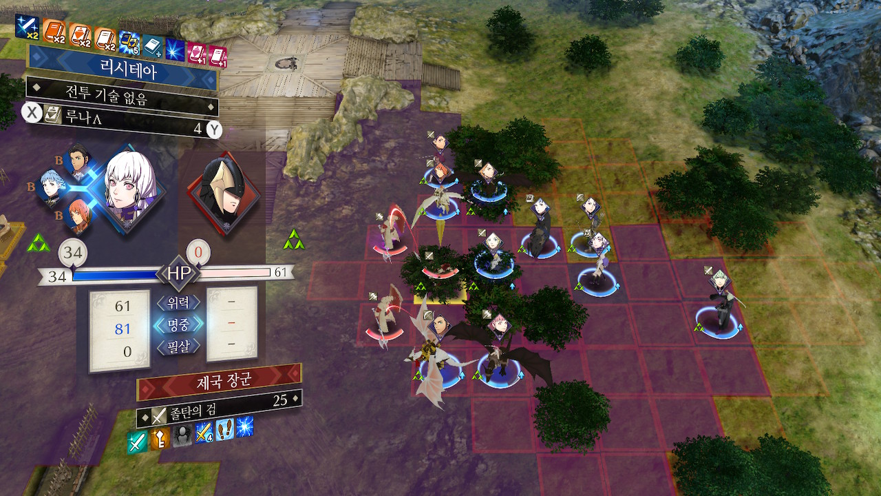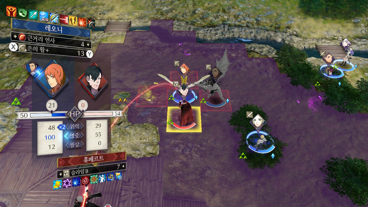 왕국군 뿐만 아니라 제국군도 달려들기때문에 레오니의 무기를 숏보우로 바꿔주고, 수풀에서 내리기를 사용한 후 경계 태세를 발동시켜주세요(근거리 반격을 쓰고 있다면 굳이 숏보우로 안바꿔도 됩니다).