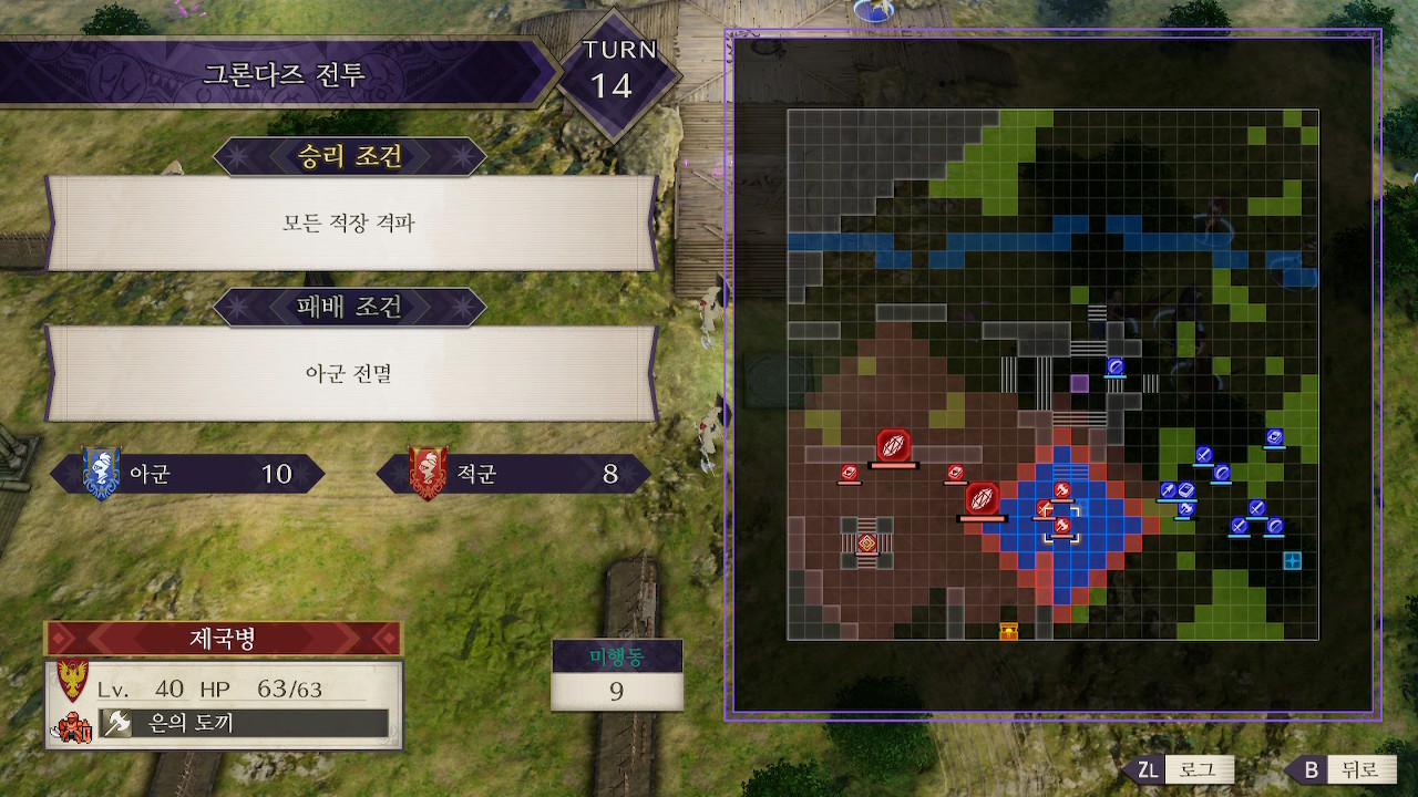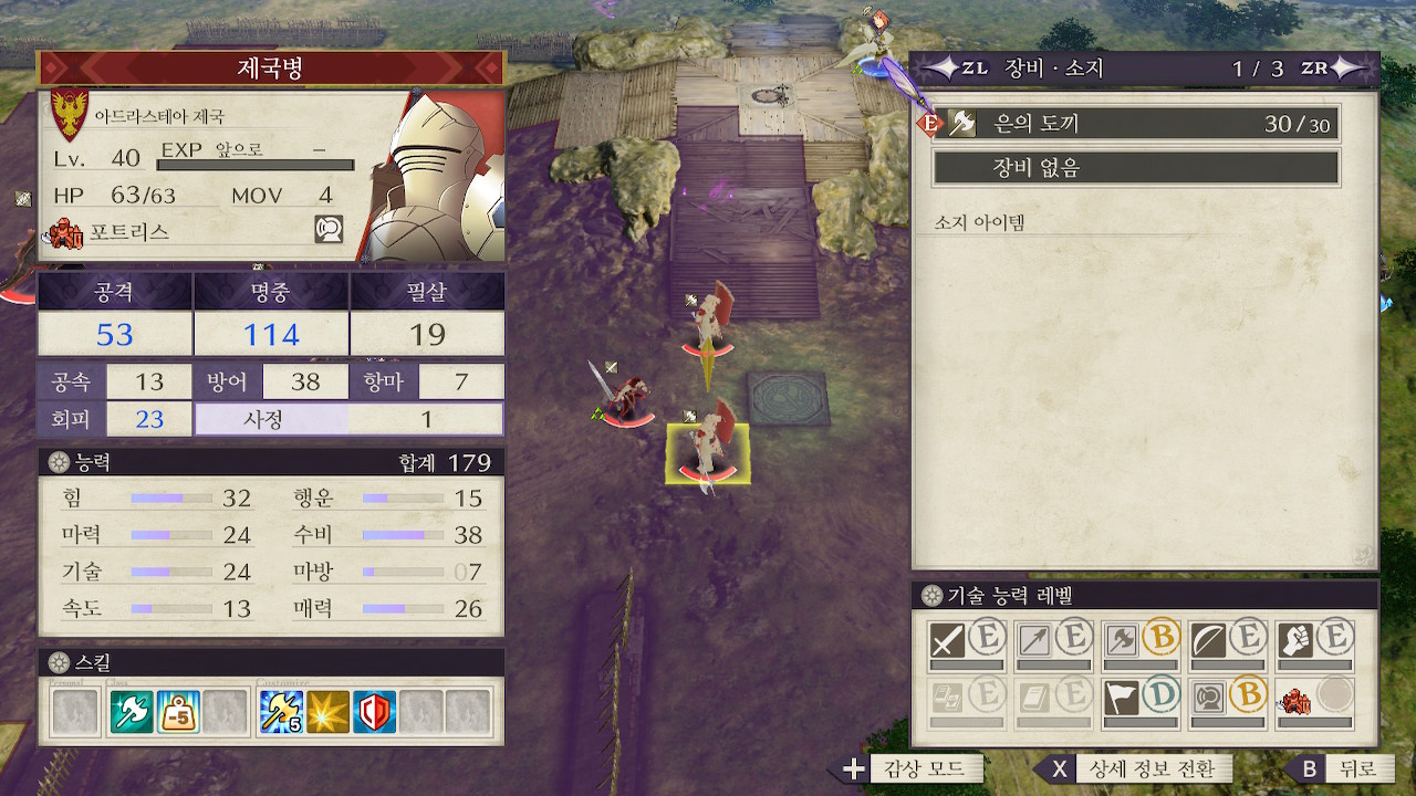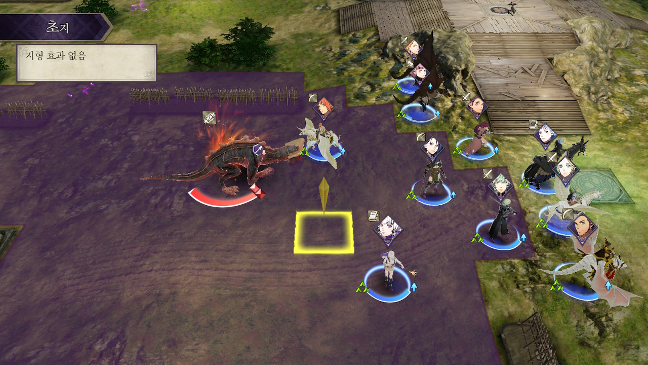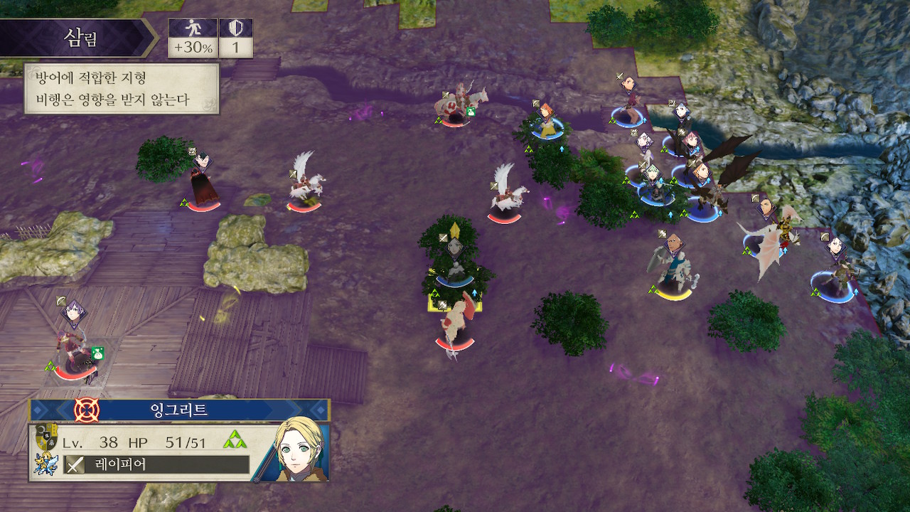 왕국군 뿐만 아니라 제국군도 달려들기때문에 레오니의 무기를 숏보우로 바꿔주고, 수풀에서 내리기를 사용한 후 경계 태세를 발동시켜주세요(근거리 반격을 쓰고 있다면 굳이 숏보우로 안바꿔도 됩니다).