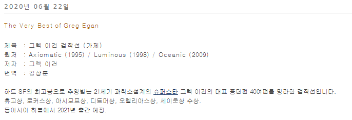 도대체 언제 나올까 궁금해서 일주일에 한번정도는 구글에 동아시아 허블을 쳐보는데, 트위터에 가보면 그렉 이건 이야기는 없고, 여성주의와 sf가 허버허버 만나서 오조오억 증쇄를 했다는 이야기같은 거 밖에 보이지 않는다.
