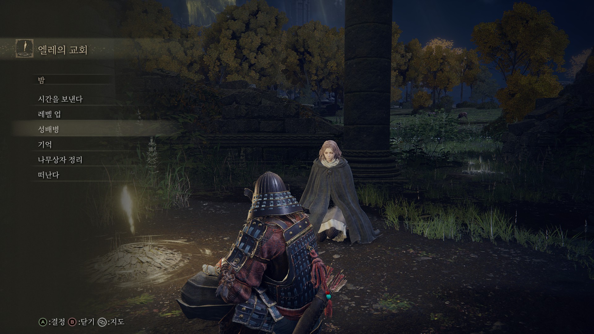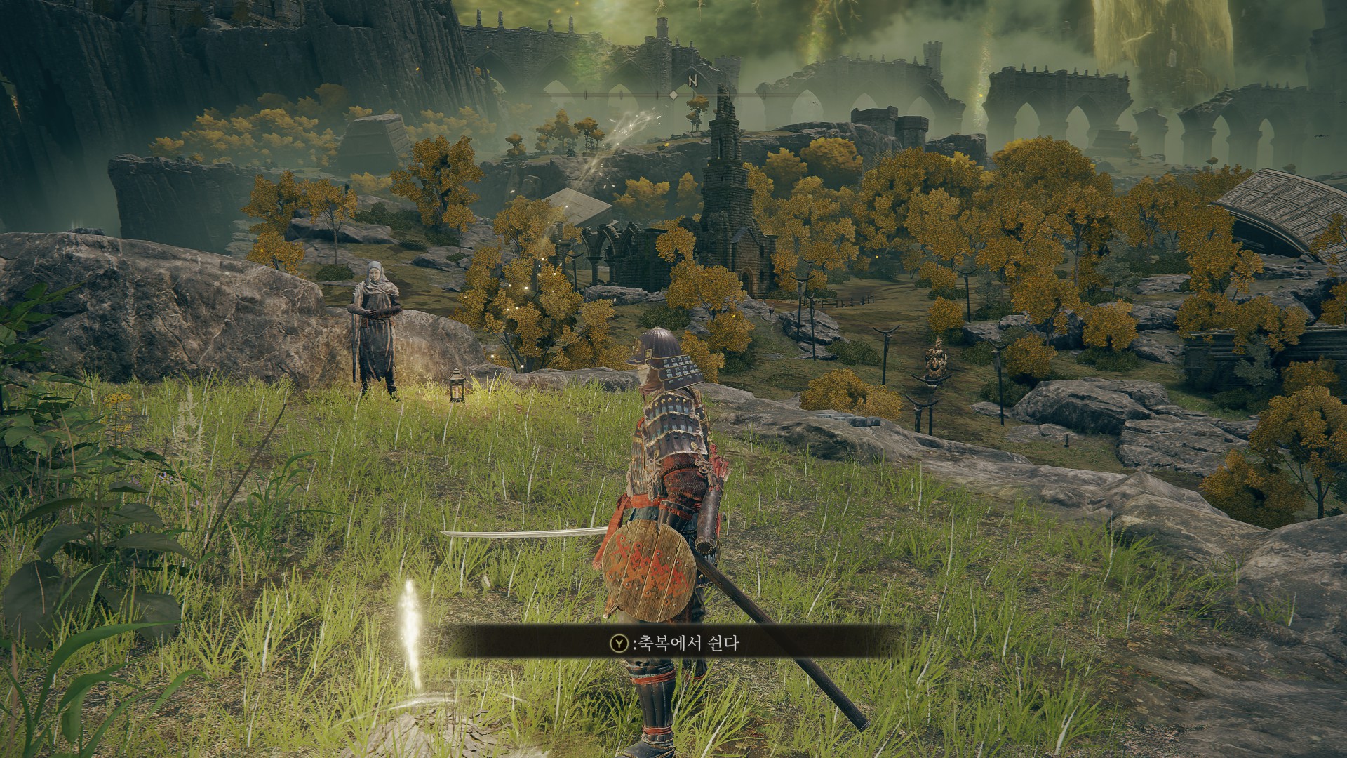 바깥에서 볼 수 있는 첫번째 축복(=화톳불)을 켰더니, 빛이 근처에 있는 축복위치를 가리킵니다.