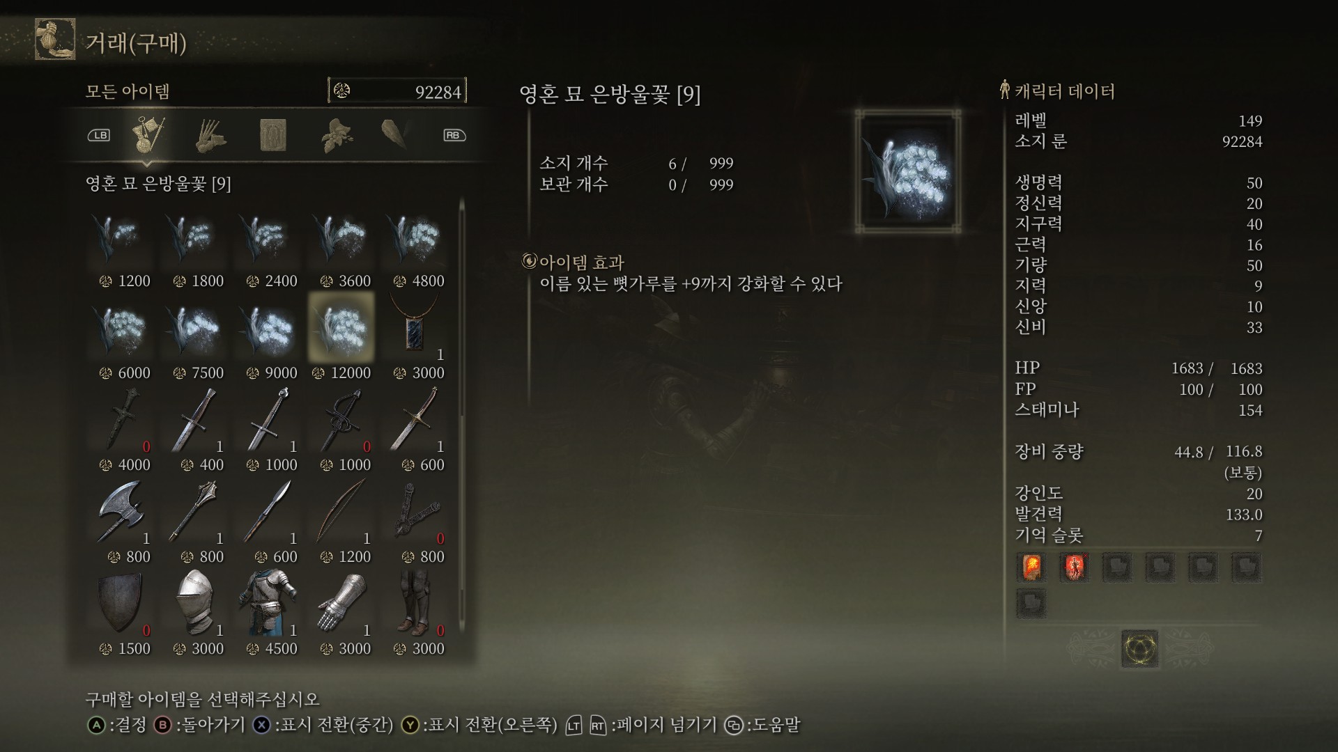 저는 저곳에 처음 가봤다가, 벌레들한테 쫓기면서 아이템만 주워먹다보니 획득 스샷을 미처 못찍었습니다. 여튼 방울을 먹은 다음에는 원탁 할매한테 방울을 주시면 되고, 그 이후로는 상점 취급 물품에 영혼 묘 은방울꽃 7,8,9가 추가됩니다.