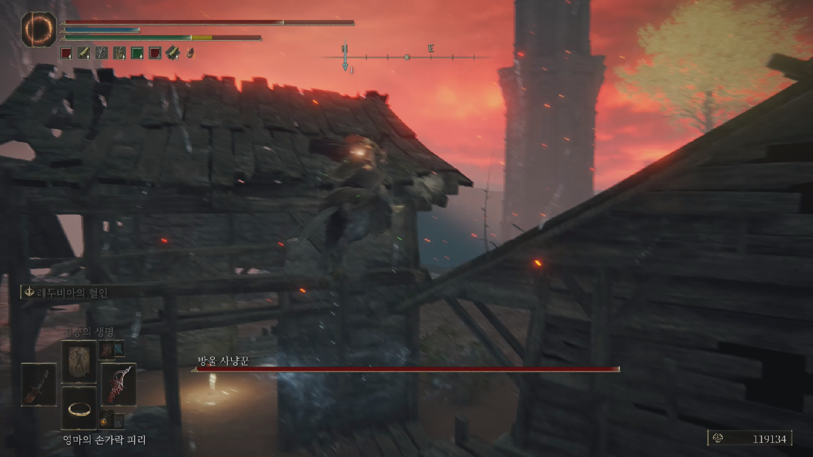 그러면 플레이어쪽을 향해 또 슬슬 걸어오는데 반대쪽 지붕으로 넘어가서 독화살을 몇대 쏴줍시다.