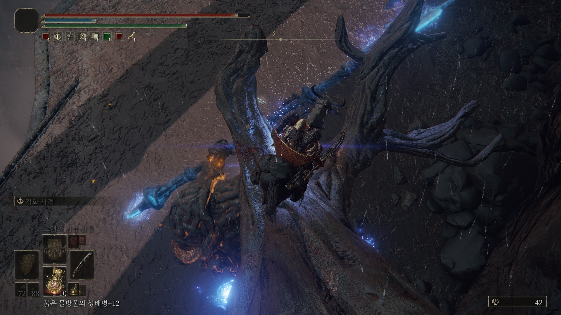 아주 개같은 곳에 나무 뿌리를 박아놨는데, 첫번째 뿌리는 은묘 반지를 장착하고 말의 2단 점프를 이용해서 가세요.