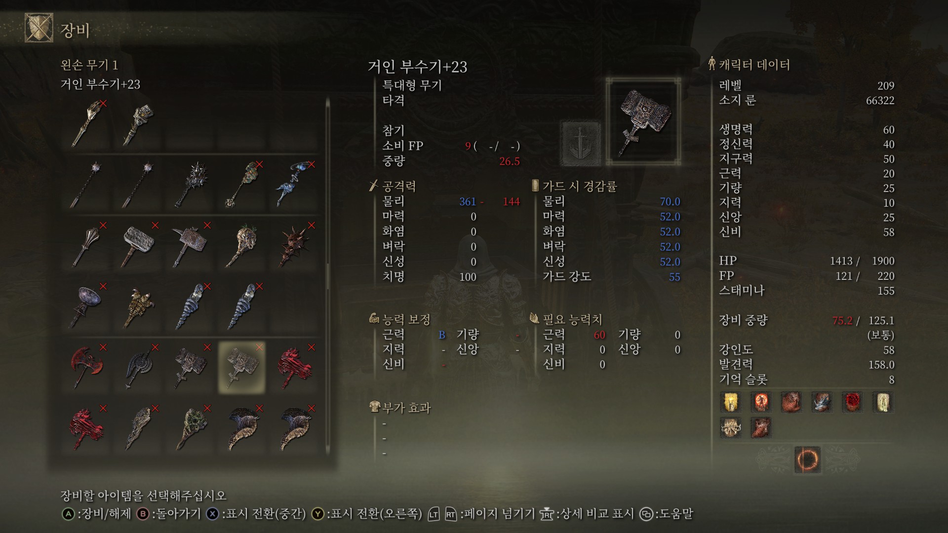 특대형 무기 중에 유달리 깡딜이 높고, 근력 보정이 좋은 편입니다.