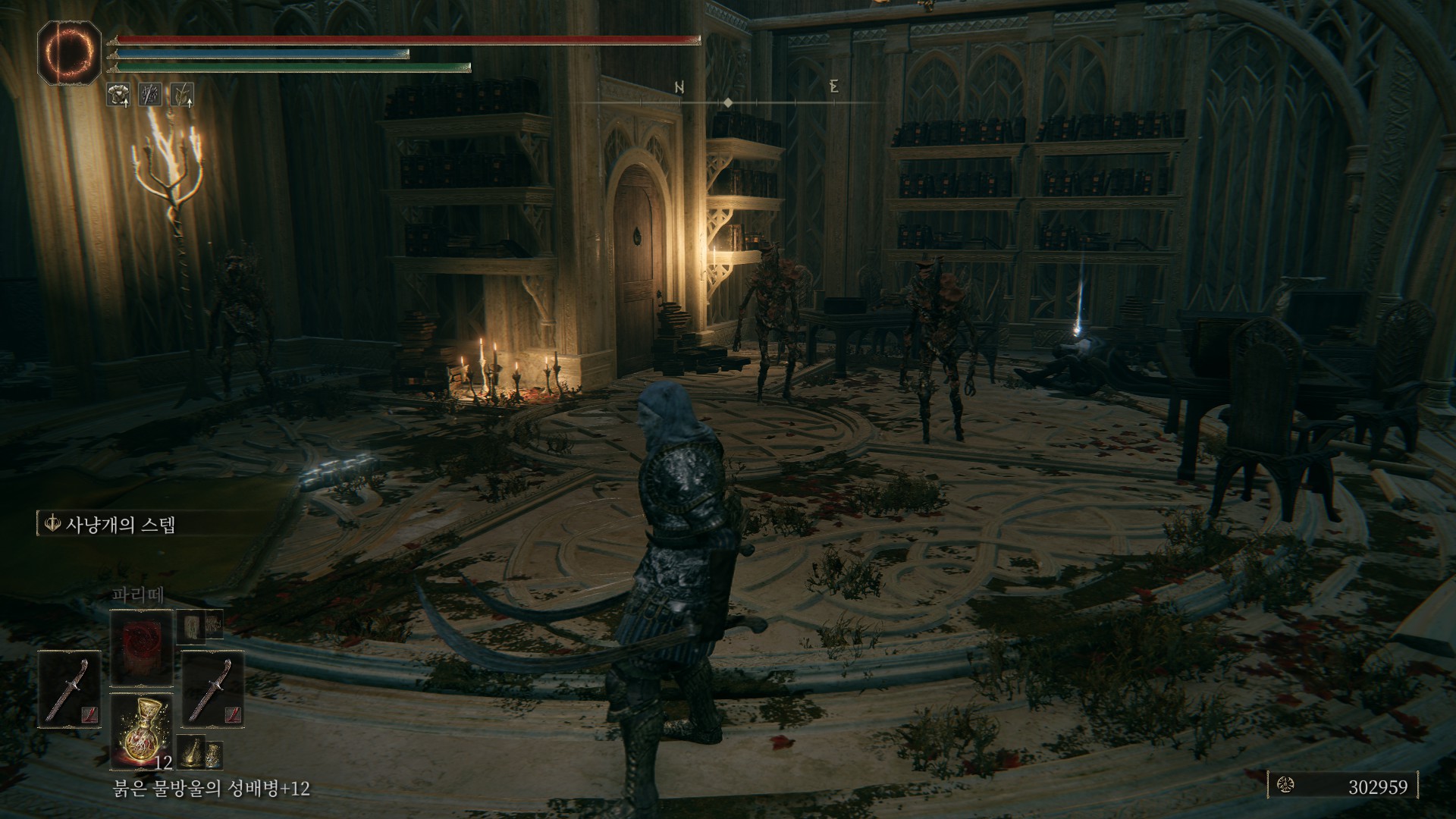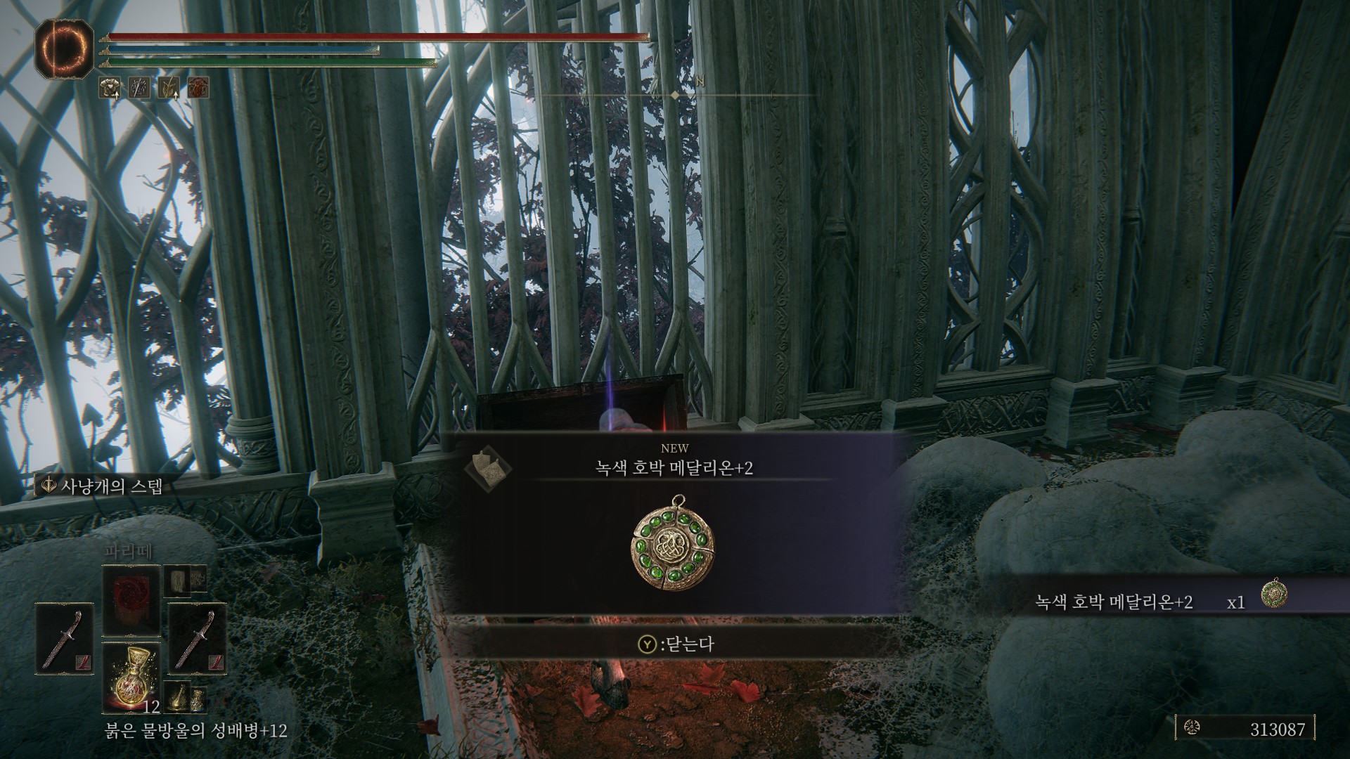 대쉬 점프로 넘어간 후 방안을 둘러보면, 보물상자에서 녹색 호박 메달리온+2를 얻을 수 있습니다.