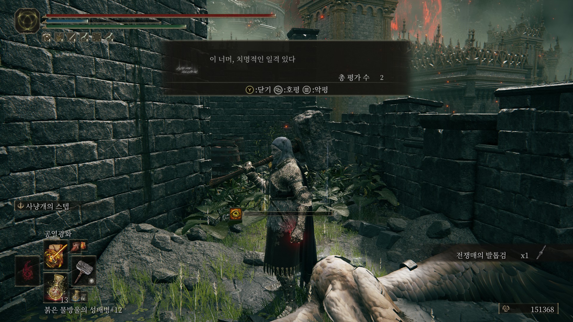 참고로 바깥에는 총 네마리의 전쟁매가 있는데 공열강화로 파밍할 경우, 좌측 성벽에 앉아있는 매는 루팅할 수가 없습니다. ..라지만 붙어서 싸워봤자 스트레스만 받으니까 한마리는 포기하는게 편합니다.
