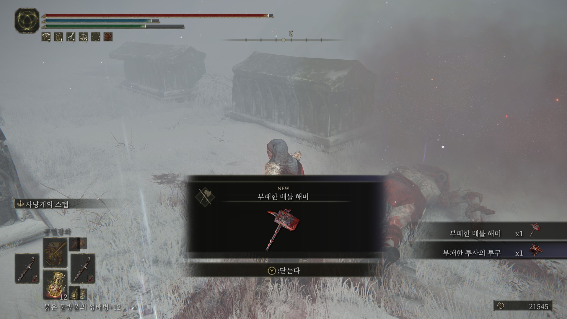 구별된 설원 축복에서 시작, 플레이어 커서가 있는 위치로 이동하면 관짝들이 보이고, 근처의 투사를 잡으면 부패한 배틀 해머와 부패한 투사의 투구를 먹을 수 있습니다.