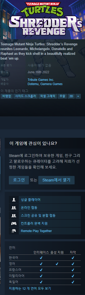 닌자 거북이: 슈레더의 복수 (Teenage Mutant Ninja Turtles: Shredder's Revenge) (nintendo.co.kr)