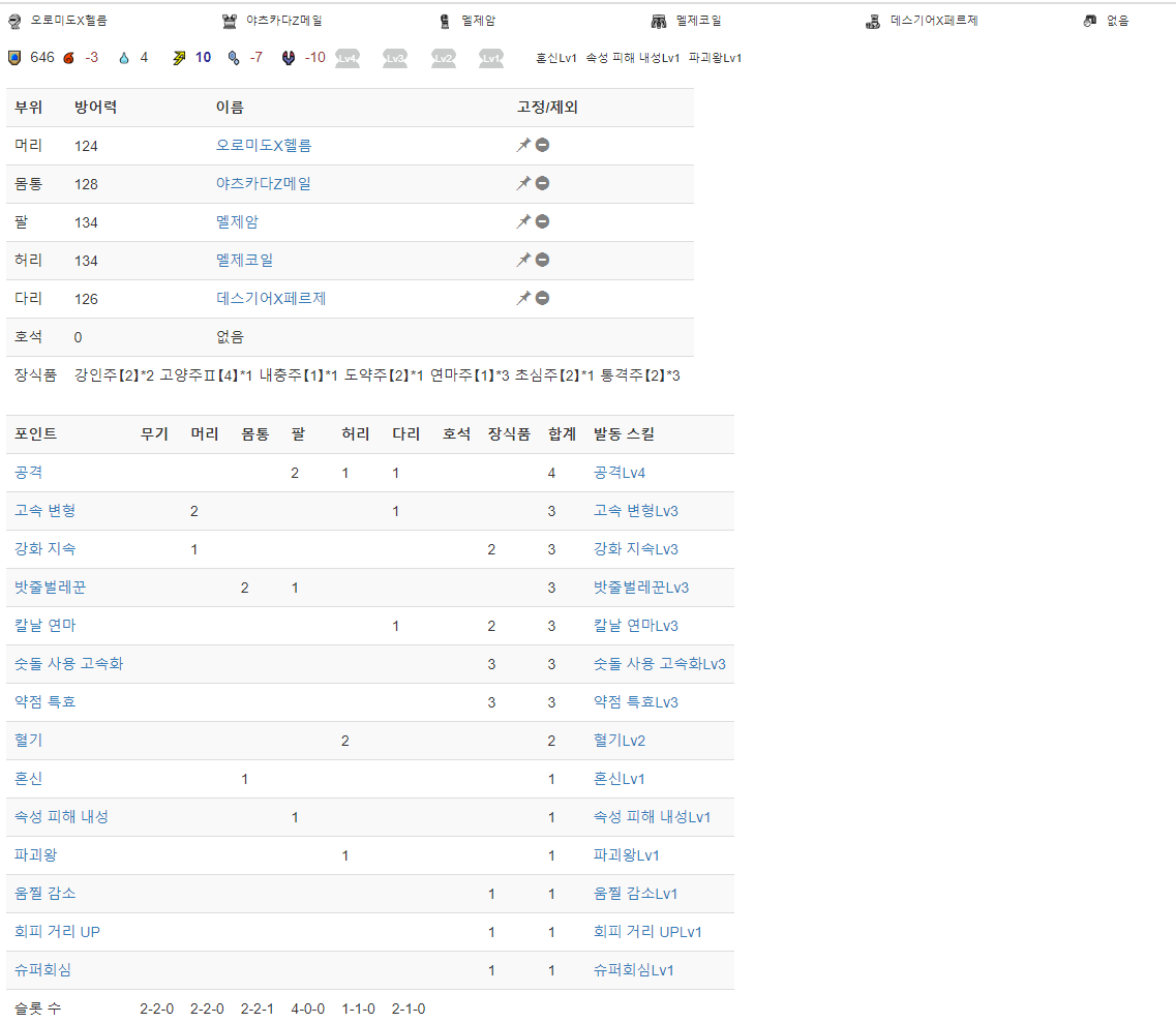 혈기2~3, 공4, 밧벌3, 고변3, 칼연3(매미용도로 쓰려는 슬액의 예리도에 따라 명검을 써도 무방), 파괴왕1~3, 약특3은 꼭 넣으시고, 여유가 된다면 매미의 생존을 위한 유틸기를 넣고, 그래도 슬롯이 남는다면 깡공 스킬들을 더 챙기는걸 추천합니다.