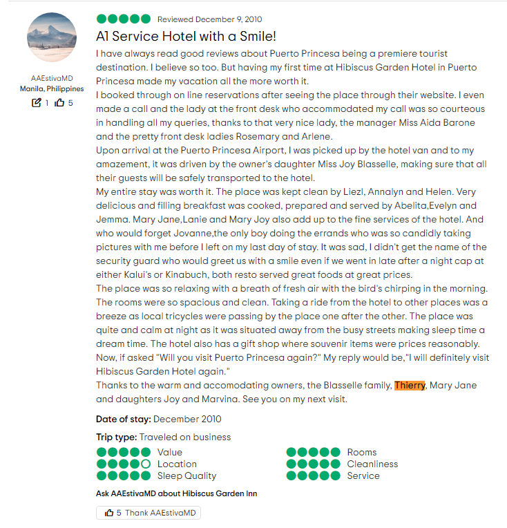 섬은 그렇게 됐다 치고 정작 주인공인 가족들에 관한 이야기는 sns(?)나 유튜브에도 없어서, 구글링을 해봤더니 필리핀에서 민박집을 운영중인 것 같다. -참고로 영상에서는 프랑스 아저씨 이름이 씨어리 블라셀이라고 나오는데, 의류 브랜드도 아니고 사람 이름이 Theory인 건 이상해서 Thierry로 검색을 해보았다.