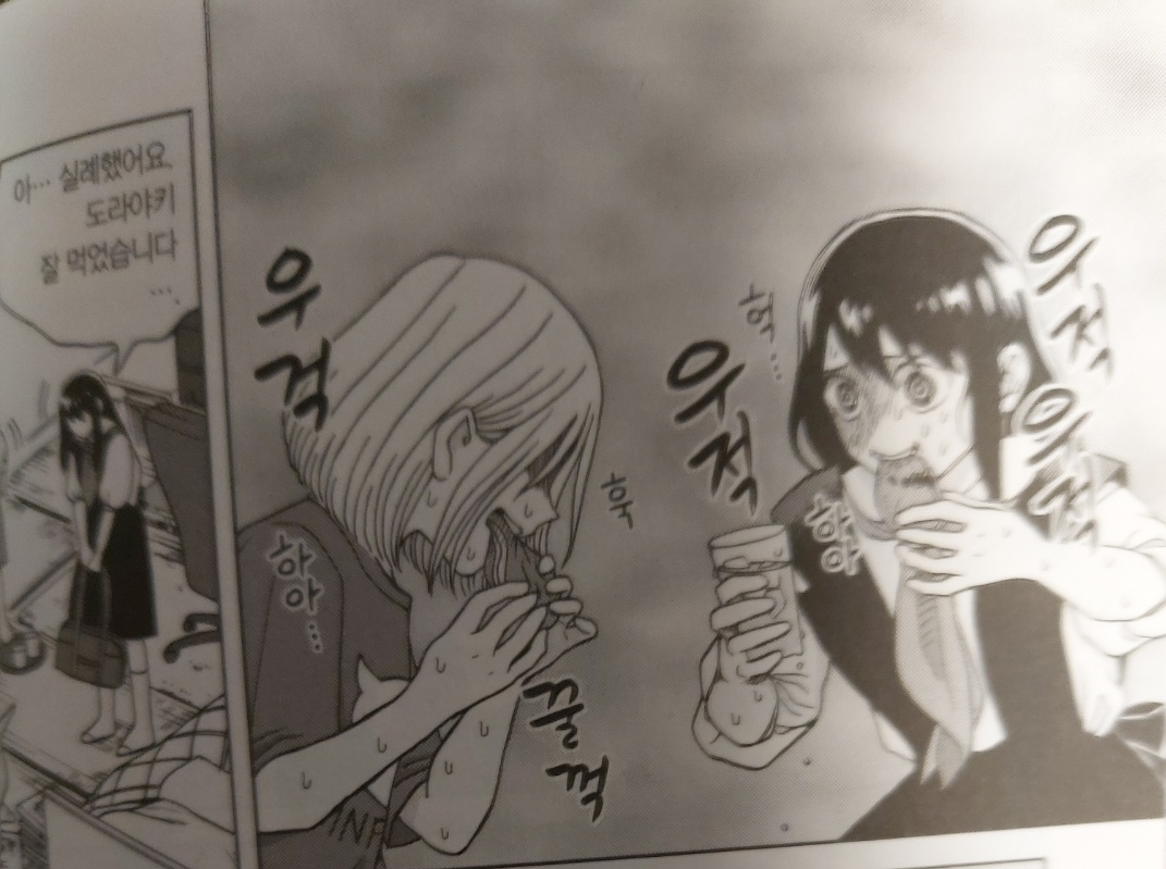 숨막힐 것 같은 분위기 속에서 JK히키코모리와 찰보리빵(?) 먹방이 한창이다.