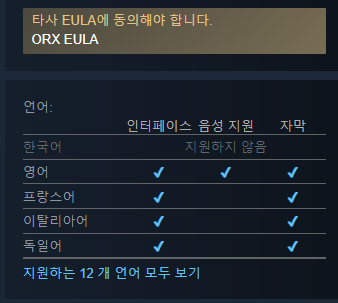 이전에는 한국어 지원에 체크가 되어있었는데, 오늘 확인해보니 빠졌네요. 나중에 패치로 풀 수도 있는데 근시일 내에는 계획이 안잡혀있는 것 같습니다. 게임물 관리 위원회에 등록도 안되있는걸로 봐서, 그냥 없던 일로 할 수도 있고(...) 한참 후에나 추가될 수도 있고