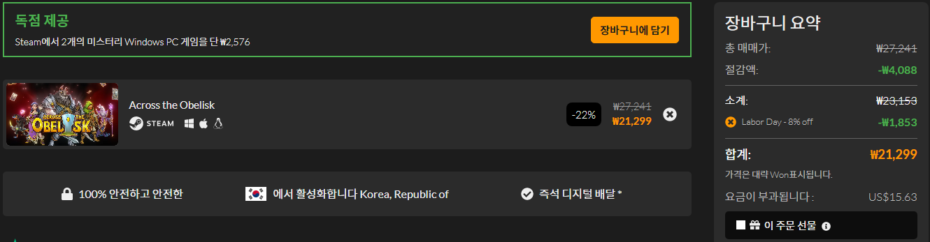 도저히 믿을 수 없는 현실에 노동절 쿠폰 코드를 입력했지만(labor8, 8% 추가 할인), 그럼에도 불구하고 여전히 스팀 정가보다 비싸다.