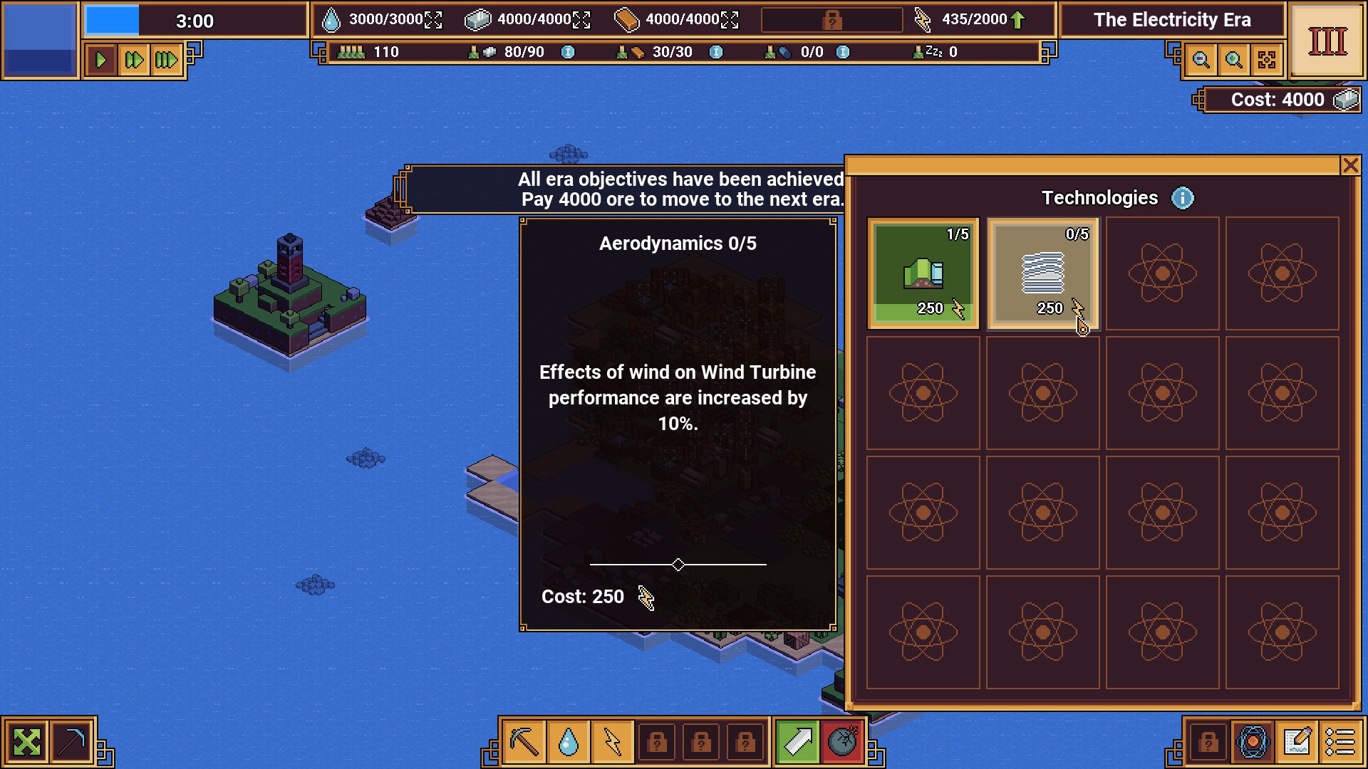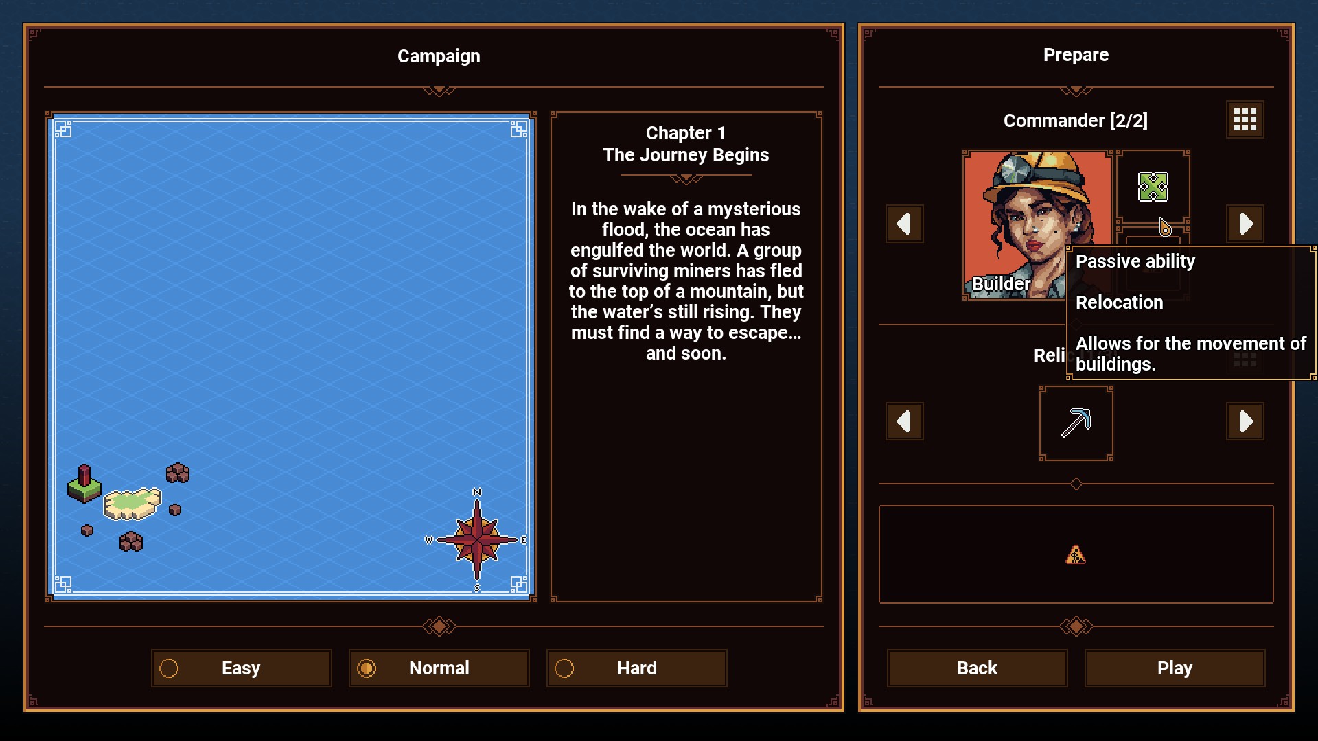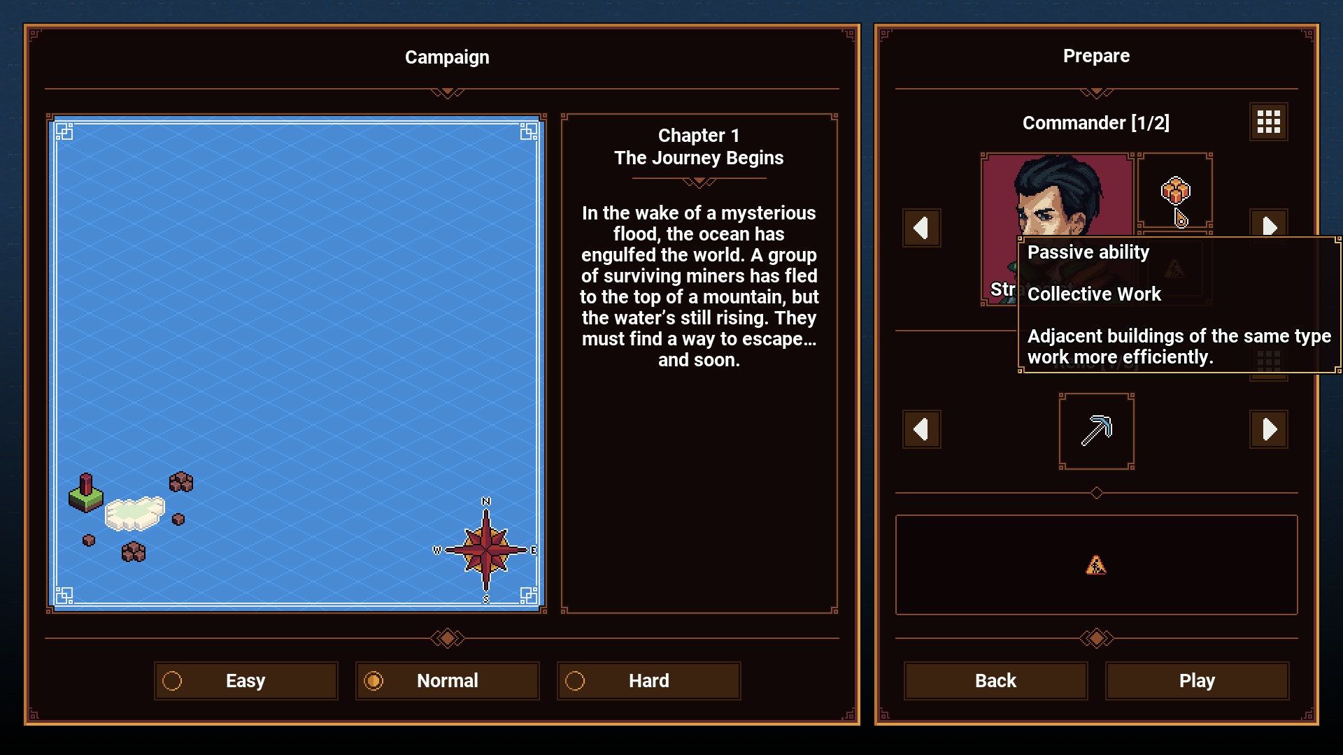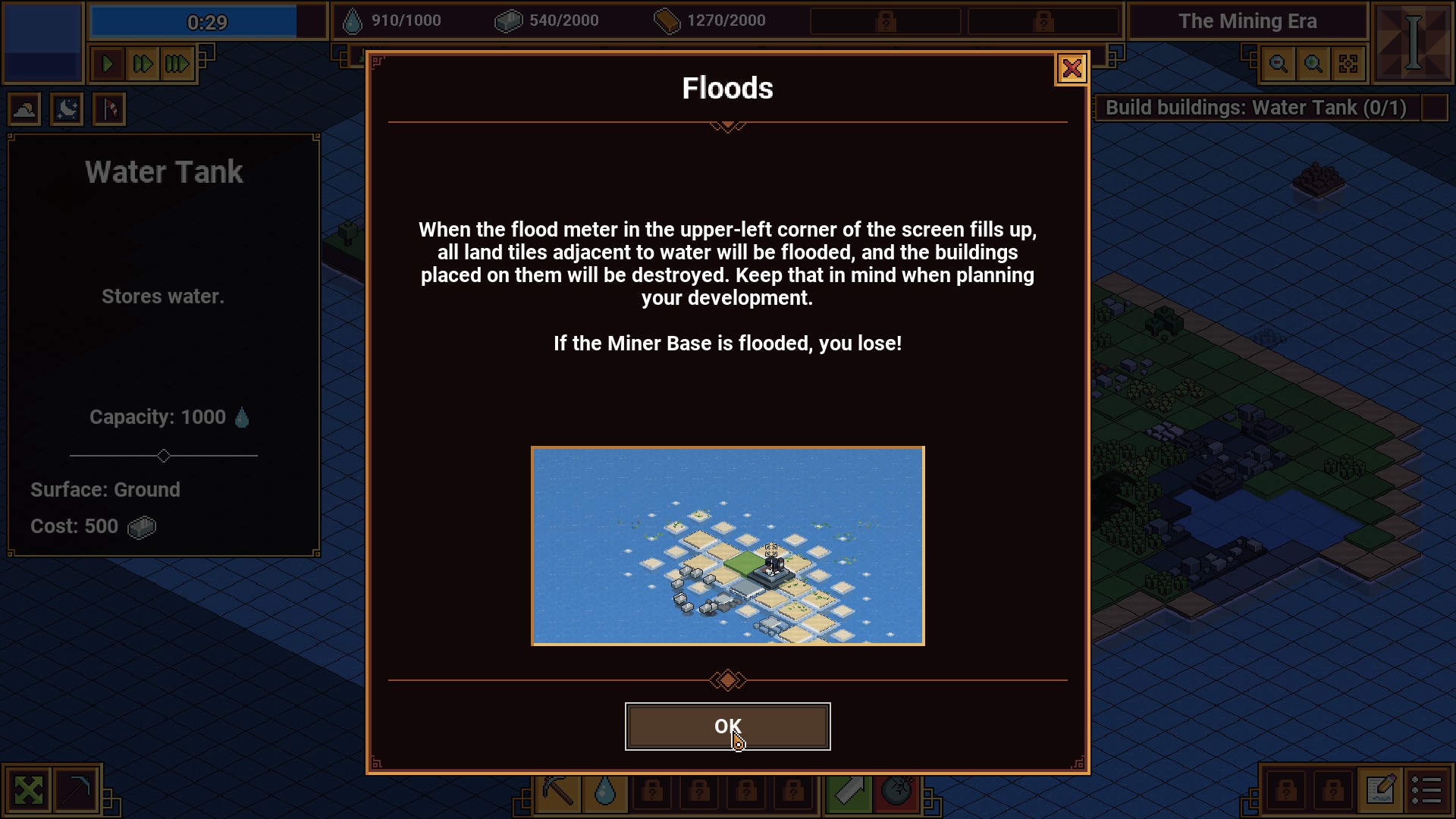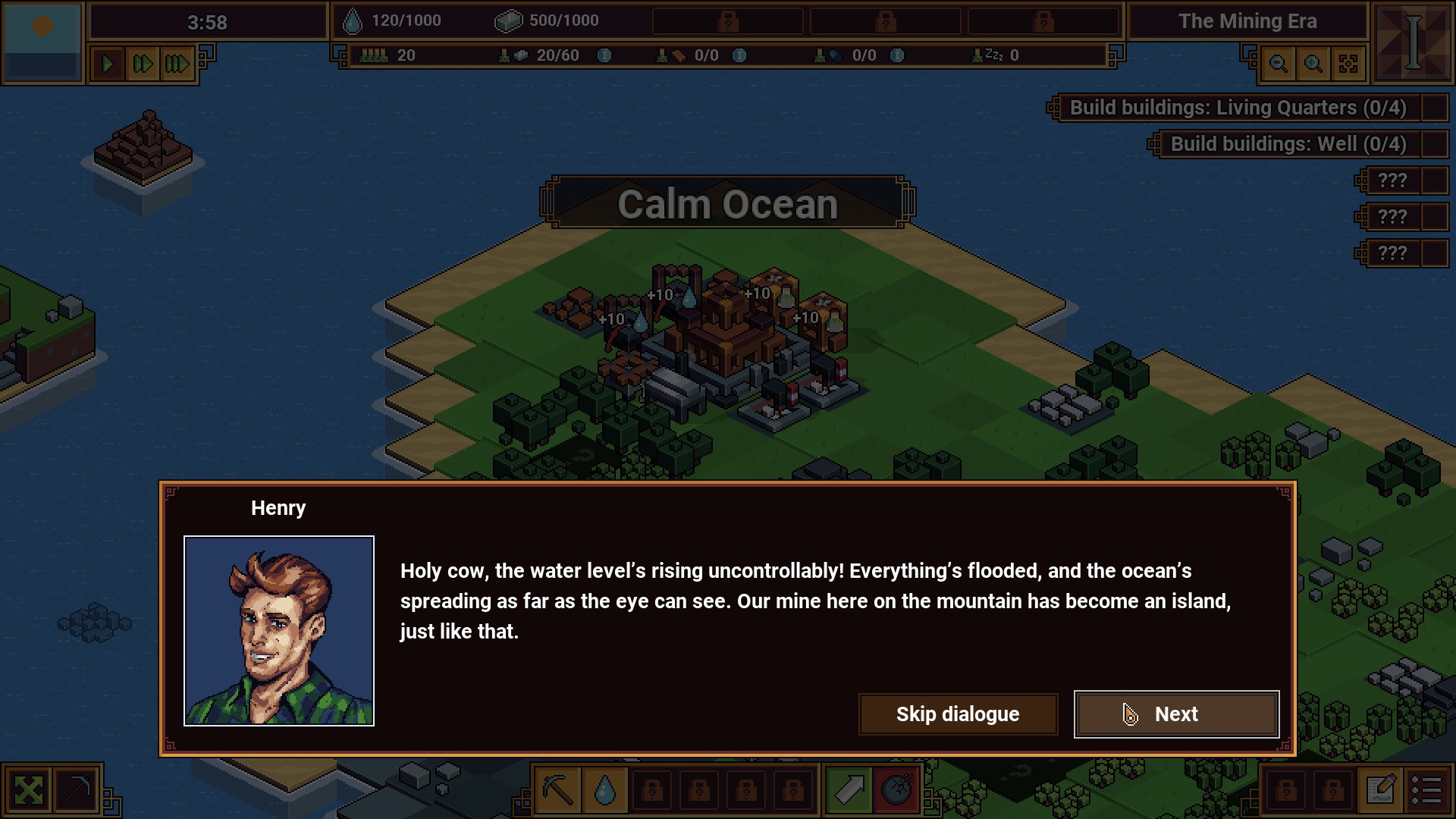 생존을 위해서는 오브젝트를 달성해서 기술들을 해금해야 한다. 그 와중에 플러디드 미터는 자비없이 흘러가기 때문에 시티 빌더의 느낌보다는 시간 제한이 걸려 있는 rts에서 자원 채취 파트만 떼어놓은 게임을 하는 느낌이 강하게 든다.
