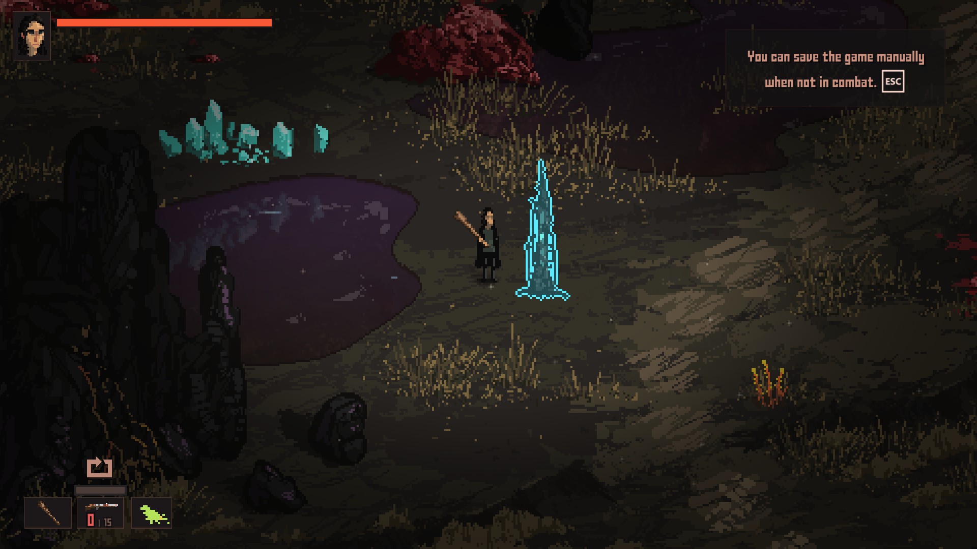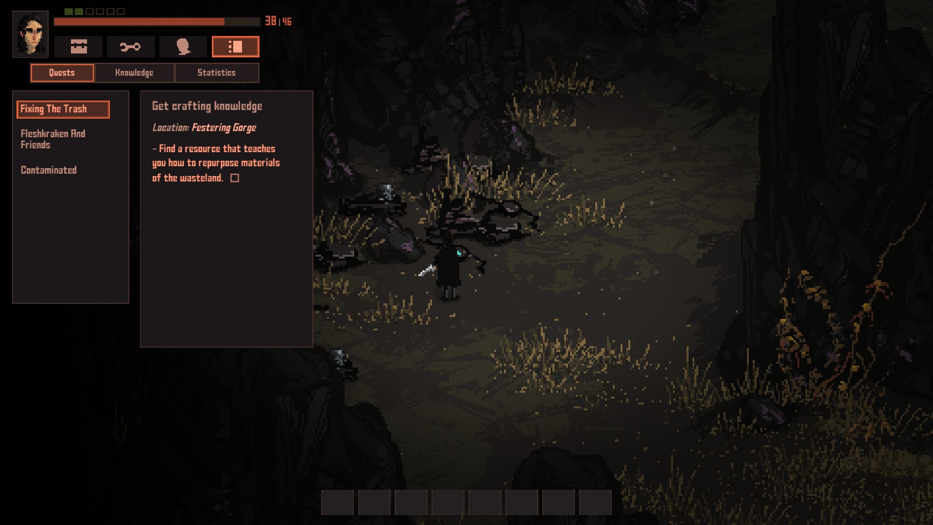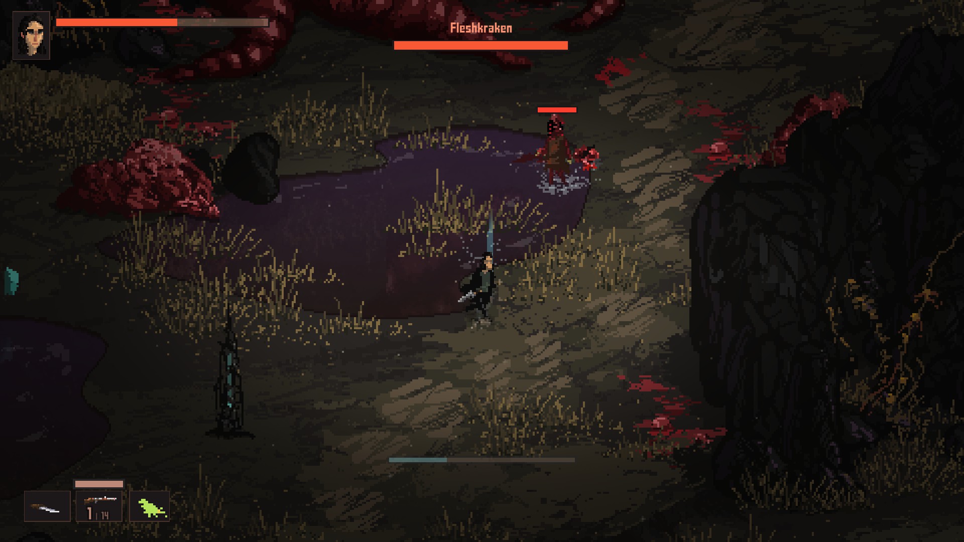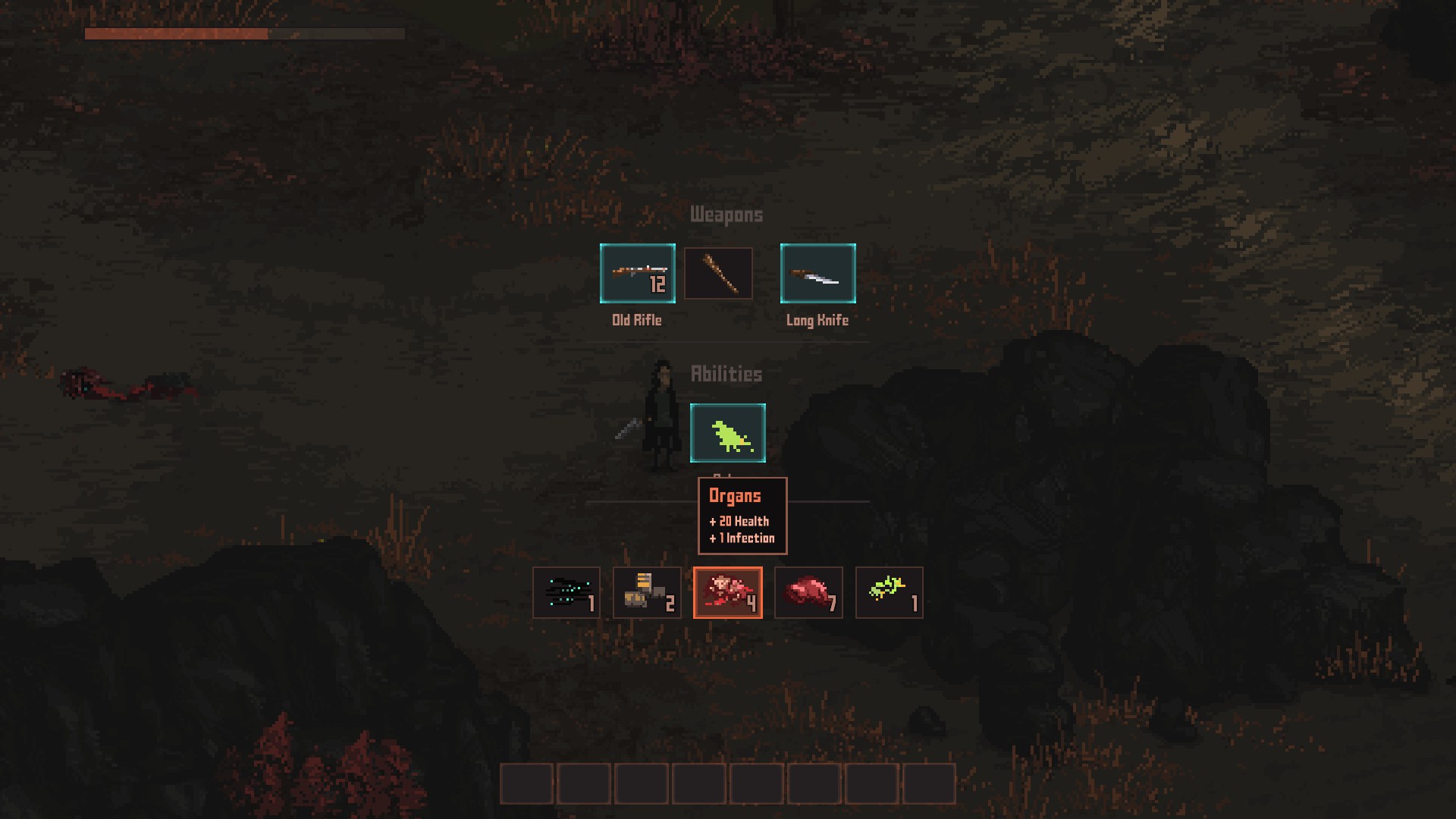 내가 날파리처럼 잘 죽을 수 있다보니, 초기의 전투는 뒤통수에 칼침을 박고, 한두대 치고, 구르기, 다시 한대 치고, 구르기의 반복입니다. 전투 중에 한대라도 맞았다? 그러면 길바닥에서 주운 살덩이나, 방금 죽인 괴물의 살을 뜯어먹어서 피를 회복해야 합니다(상승하는 감염도는 덤).