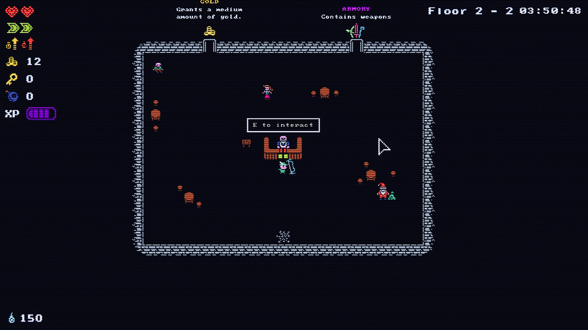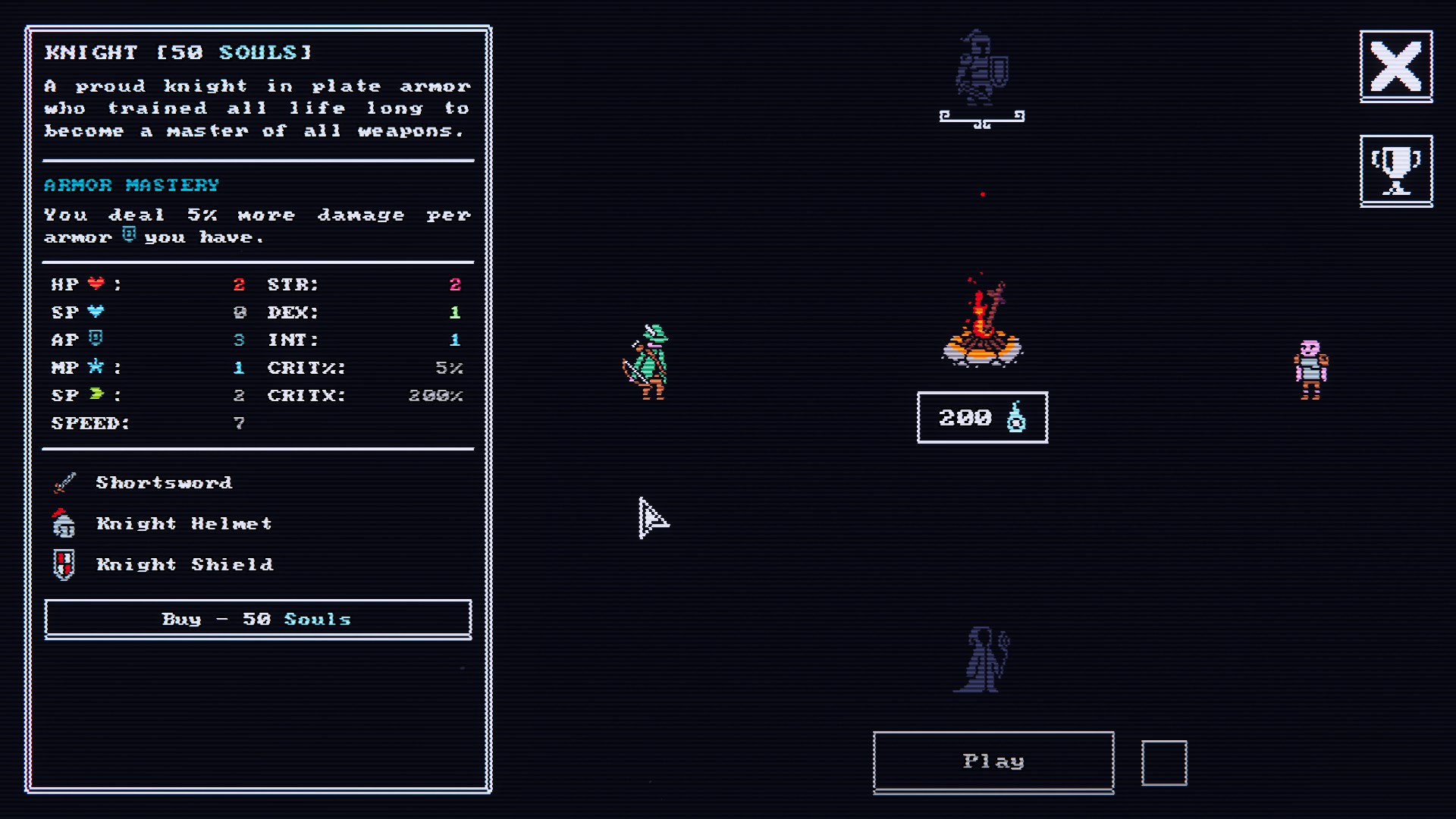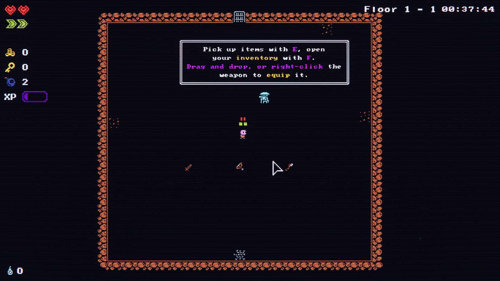 무기, 방어구, 악세사리는 방을 클리어함으로써 얻거나, 상인에게 골드를 지급하고 구입할 수 있다.