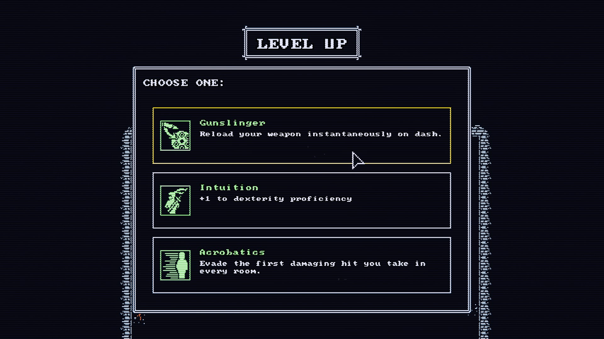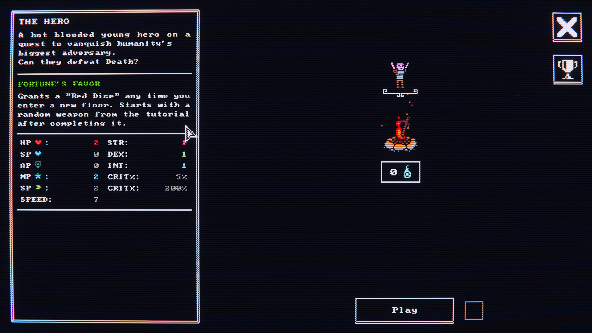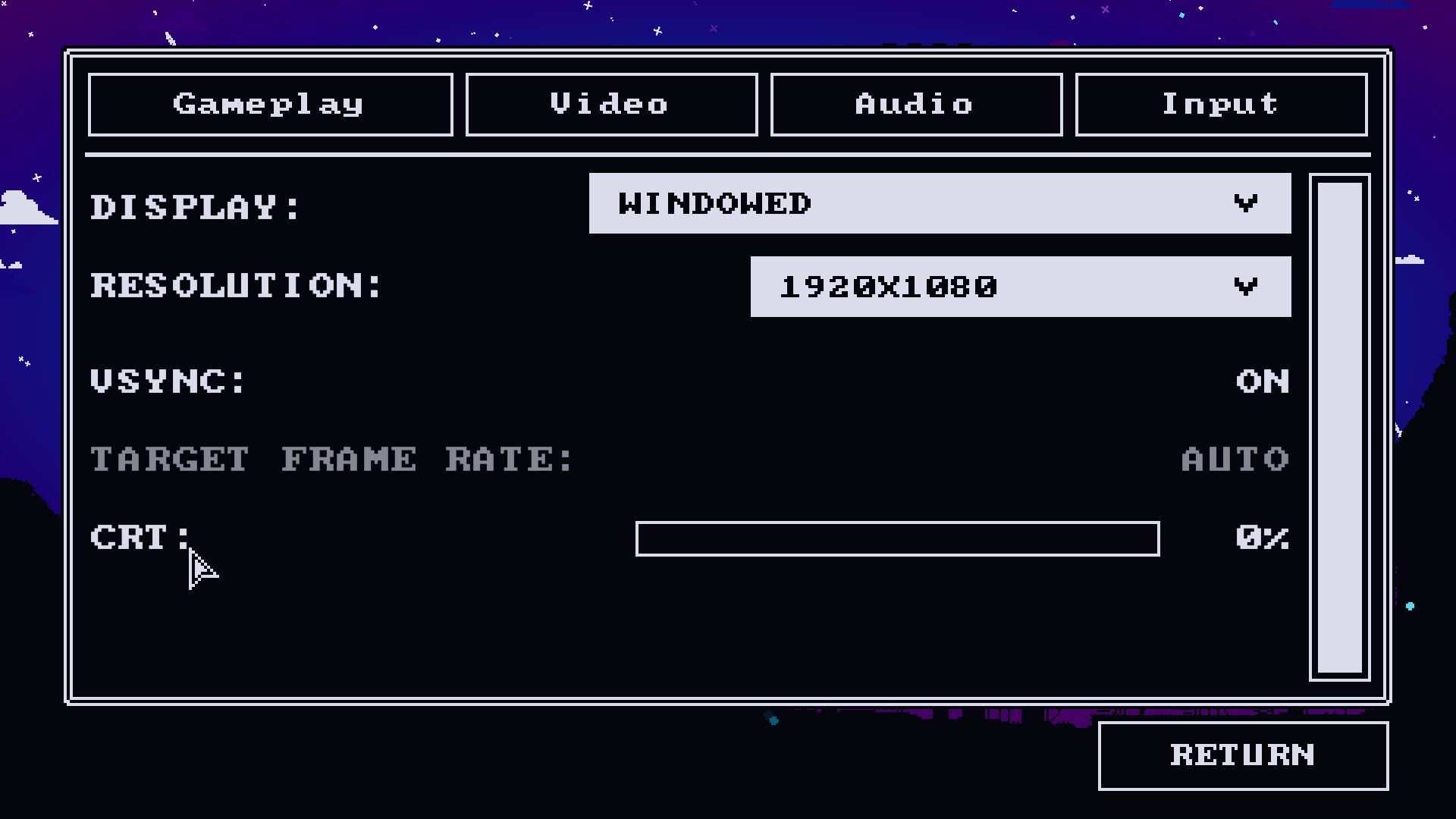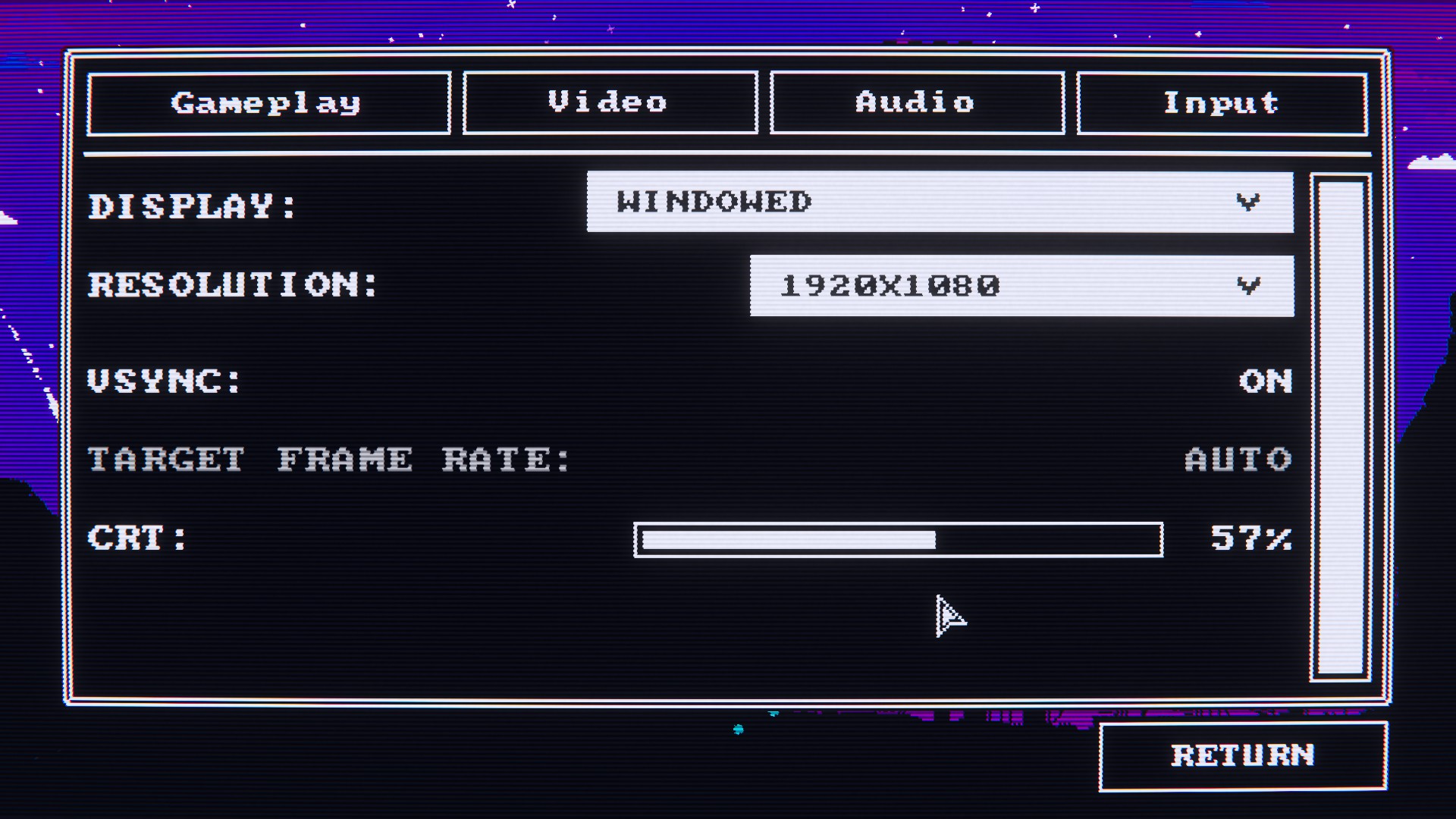 게임을 시작하면 crt 모니터를 떠오르게 하는 구수한 그래픽이 펼쳐지는데, 옵션에서는 유저의 취향에 따라서 crt의 느낌을 더하거나 줄일 수 있다(crt 옵션을 켜면 가로줄이 생성되고, 간헐적으로 위에서부터 아래로 화면이 출렁거리게 된다) .