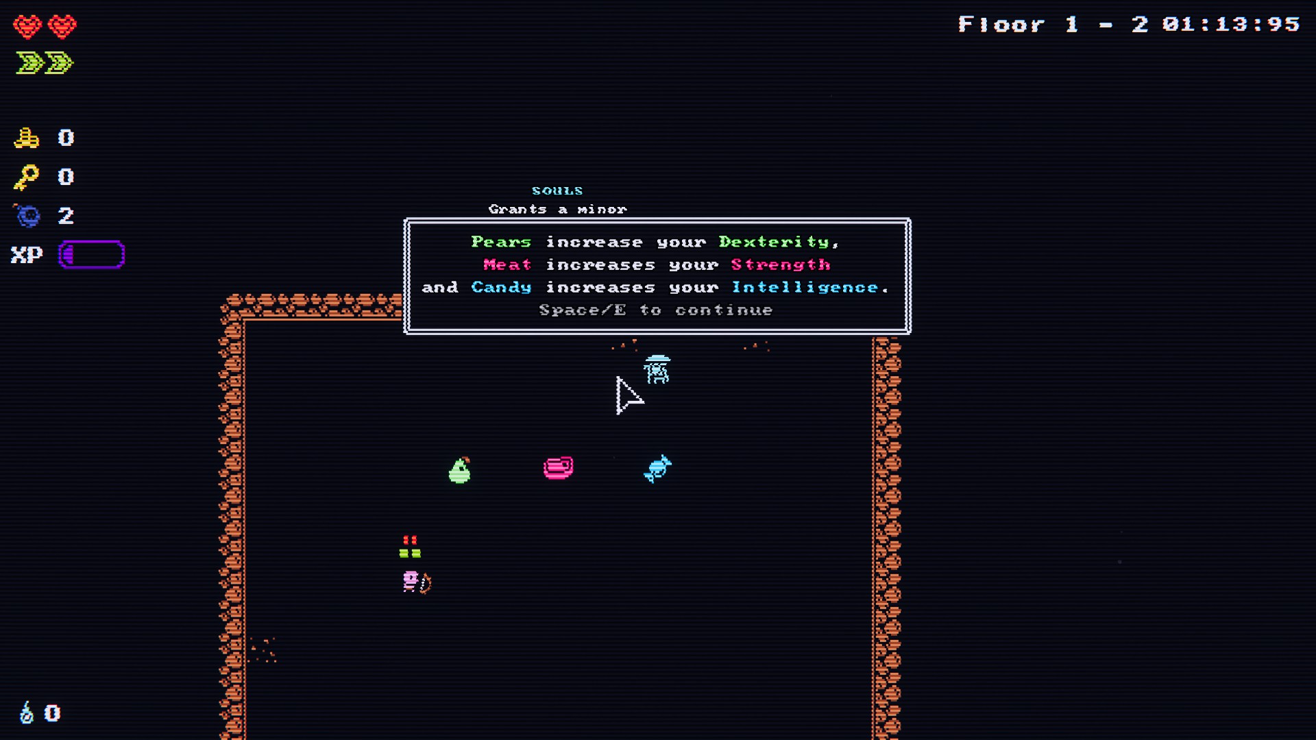 배는 민첩성을, 고기는 힘을, 사탕은 민첩성을 올려준다. 각각의 아이템을 섭취하게 되면 좌상단의 xp가 올라가게 되고, xp를 만땅 채우면 레벨업을 하는 방식이다.