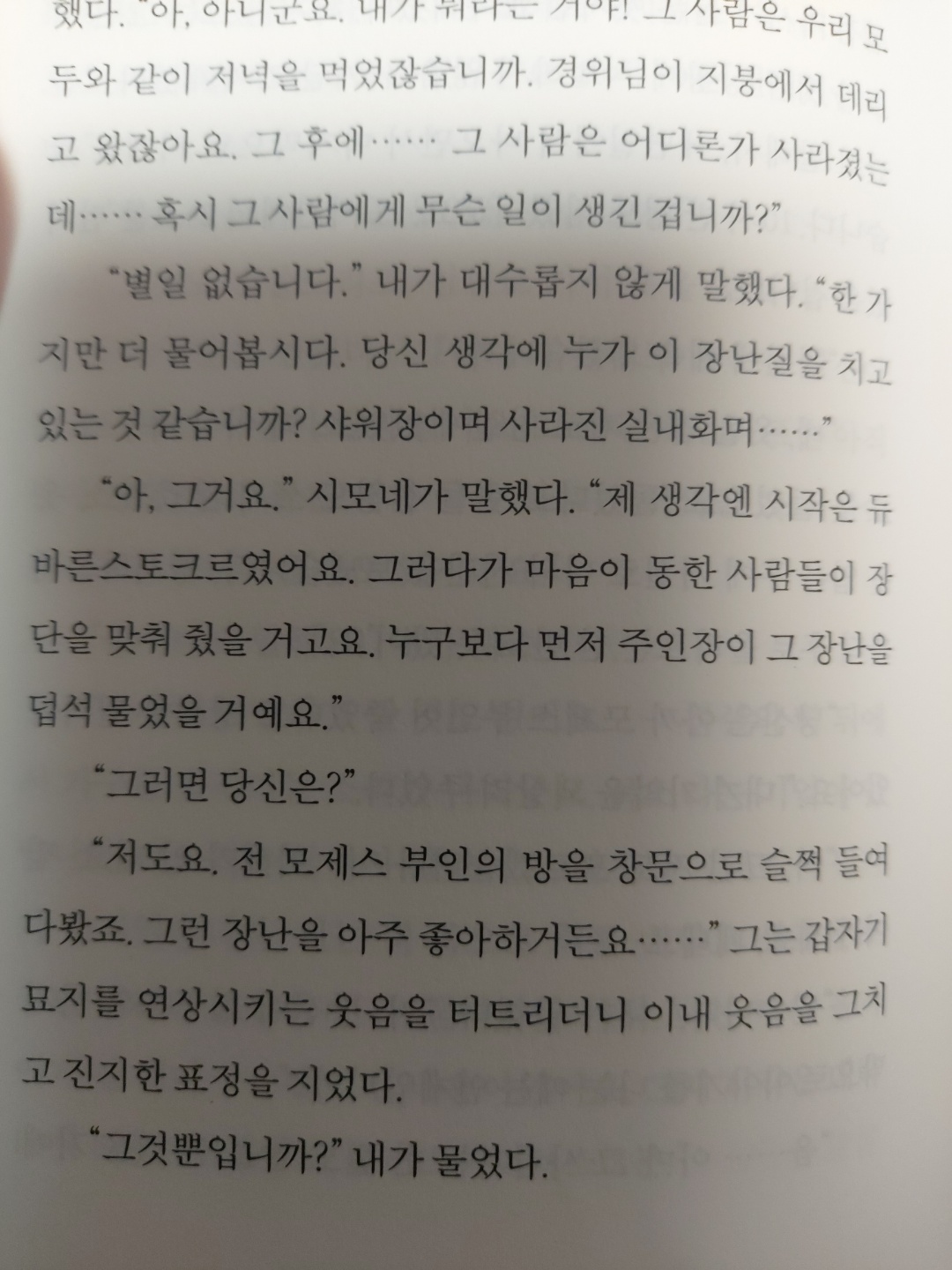5장부터는 추리물 특유의 장르적인 재미가 있다. 그런데 그 재미가 지속적이고 완성도가 높지는 않다고 생각하는데, 왜냐하면 특정 인물의 등장을 기점으로 작품 전체적인 분위기가 많이 달라지기 때문이다. 그 시점을 분량으로 따지면 승~전 사이쯤인데, 결말에 가서는 장르가 완전히 달라지게 된다.