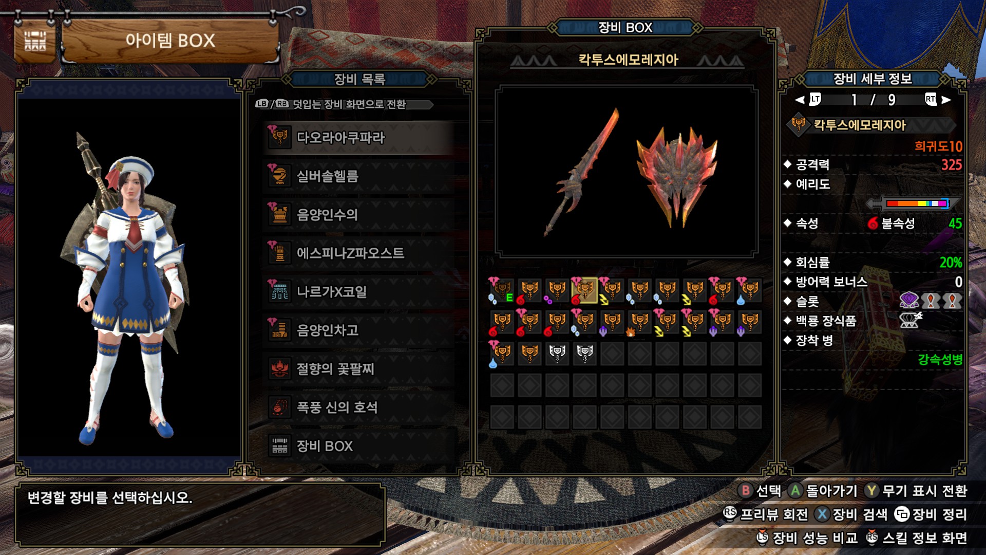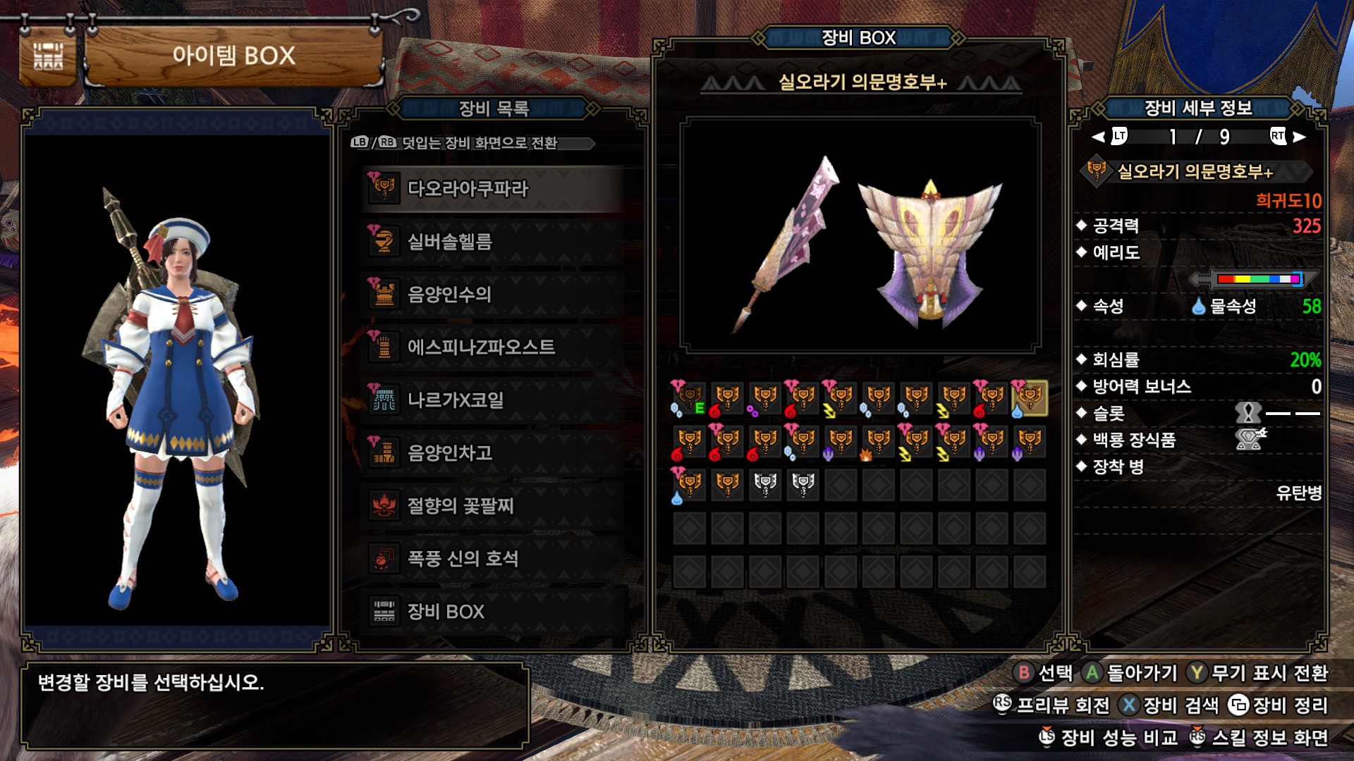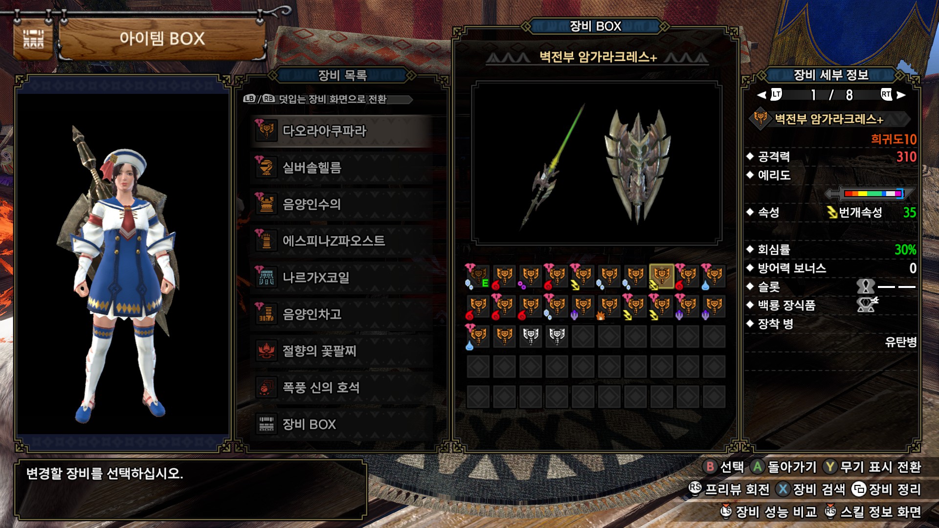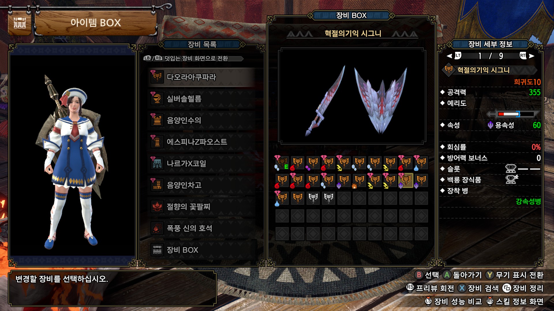 백룡 장식주 슬롯에 강혼룡주를 장착하고, 기타 스킬들로 회심을 보충해주면 달인의 재주로 보라 예리도를 관리할 수 있습니다.