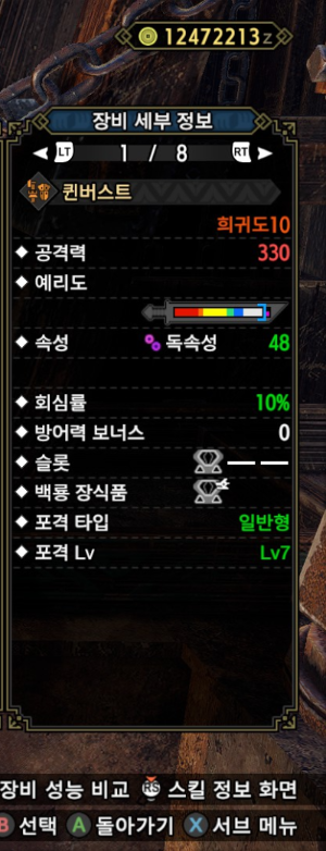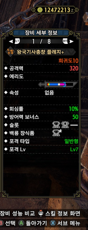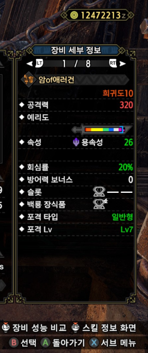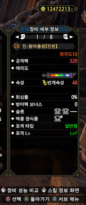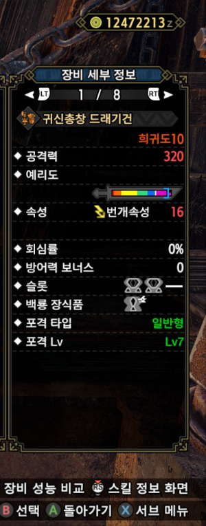 속성이 아예 없고, 회심이 0이란게 아쉽지만 참격딜, 백룡 슬롯, 슬롯을 고려한다면 이 건랜이 가장 좋아보입니다.