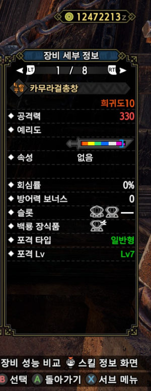 수치상으로 카무라걸 총창만큼 무난해 보이는 건랜, 범용으로 쓴다면 카무라걸 총창을, 용속 약점인 몬스터를 수렵할 때는 이 무기를 쓸 것 같습니다.