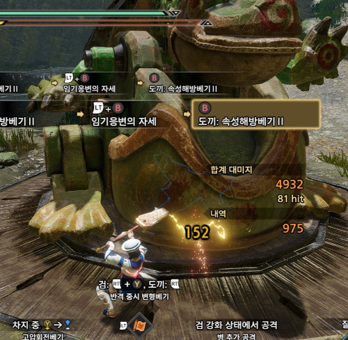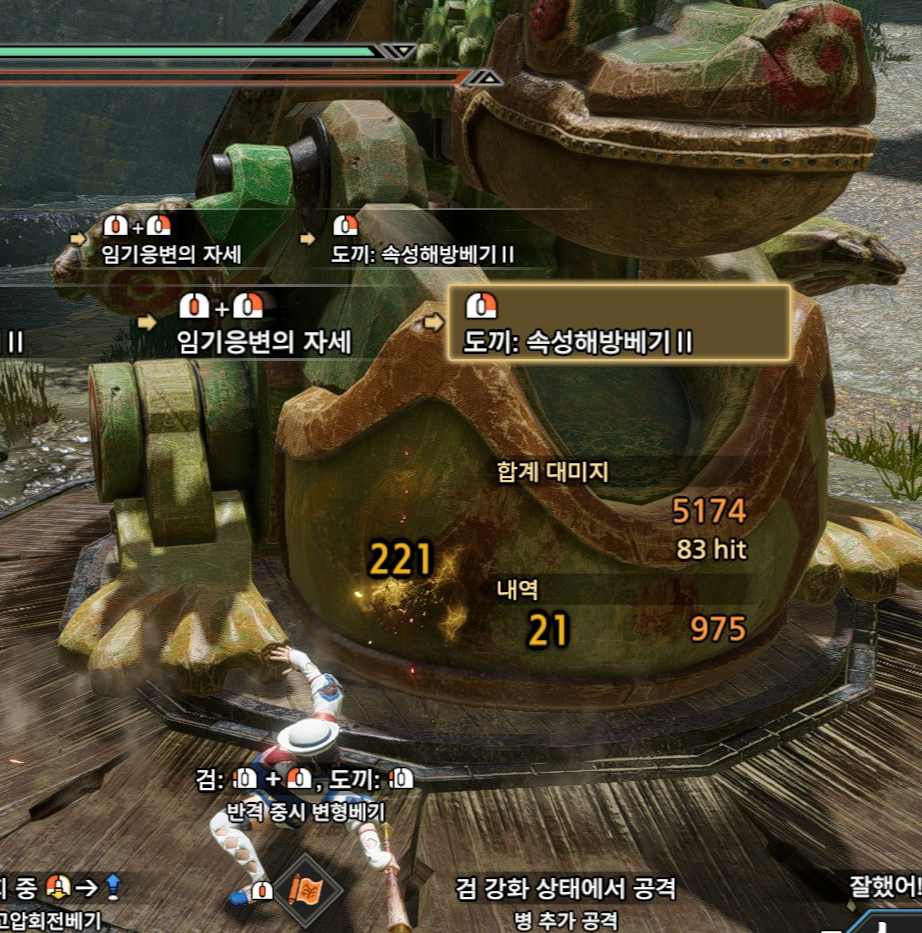 이 상태에서 기타 스킬은 동일하게 유지한 채로 물속성 공격강화를 모두 빼고, 연격1을 발동시킨 후 동일한 육질의 두꺼비를 때려보았습니다.