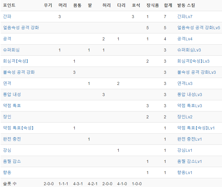 방어구 괴이강화를 하나도 안한 상태를 기준으로 시뮬을 돌려서 잡스킬이 너무 많이 붙어 있습니다.