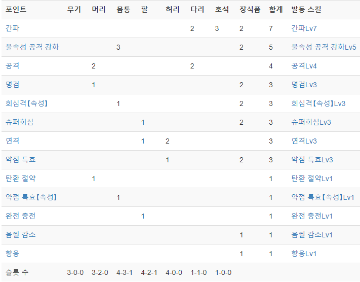 방어구 괴이 강화 추천 스킬 : 2레벨 이상의 슬롯, 장인, 공격, 간파, 회피성능 등