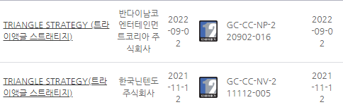 혹시나 발매일에 차이가 있을까봐 다른 게임들을 살펴 봤는데, 트라이앵글 스트래티지처럼 따로 따로 들어간 경우도 있고, 발키리 엘리시움이나 스타오션처럼 심사가 1건만 있는 게임들도 있었습니다.