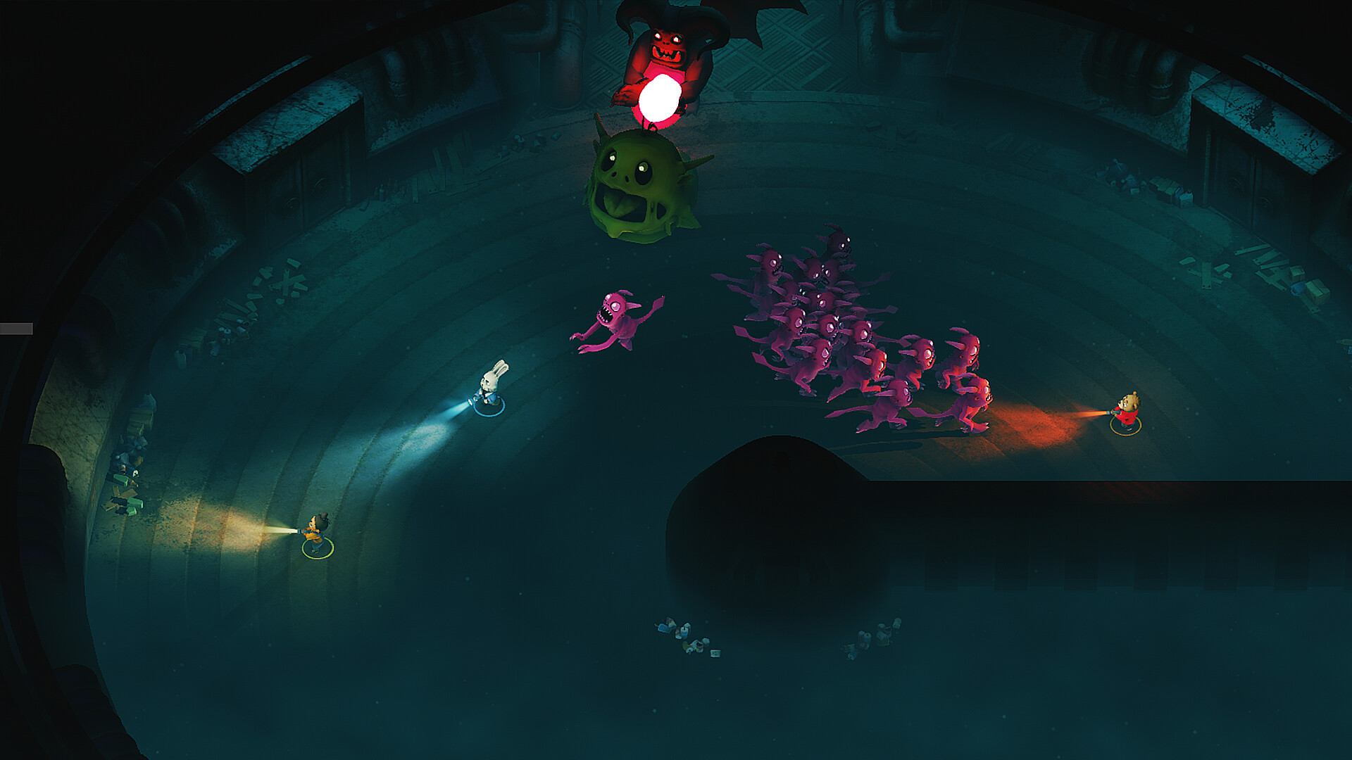 BEGONE BEAST is a spooky top-down action game for 1-4 players. HACK & SLASH & SCREAM through hordes of demons, endlessly changing levels, and ancient terrifying BEASTS. Harness the power of SNACKS, FLASHLIGHTS, and FRIENDSHIP in this scary (but also cute)