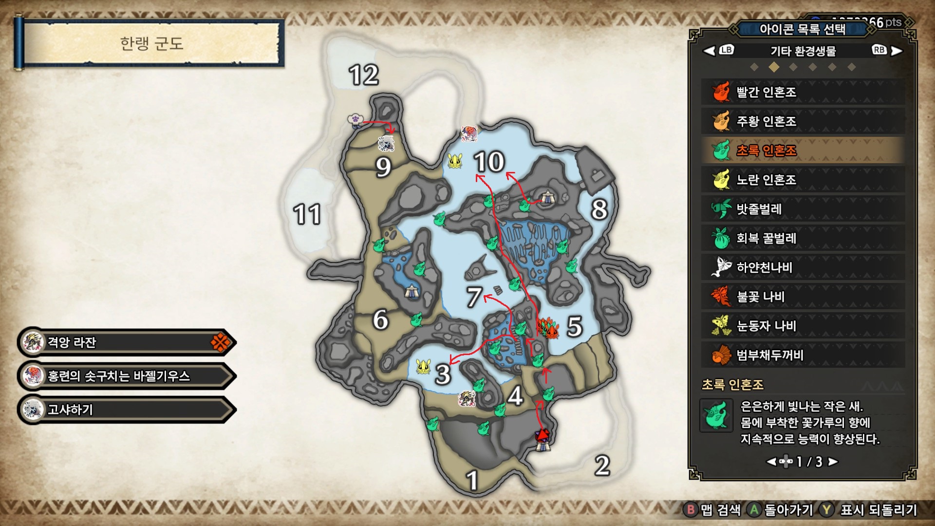 한랭 군도의 경우 10~20초 정도를 투자해서 초록 인혼조 세마리와 괴뢰 거미 1마리를 먹을 수 있습니다.