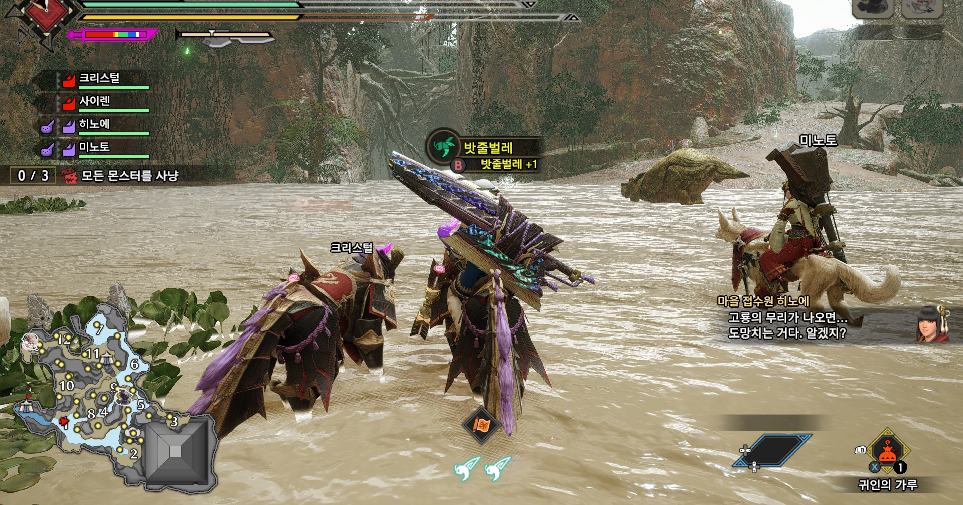 좌측의 덩굴줄기 중간에 초록 인혼조 1마리, 스샷 기준 소형몬스터가 보이는 곳으로 이동하면 초록 인혼조가 1마리 더 있습니다. 두개를 다 먹거나, 하나만 먹고 목표 구역으로 가면 됩니다.