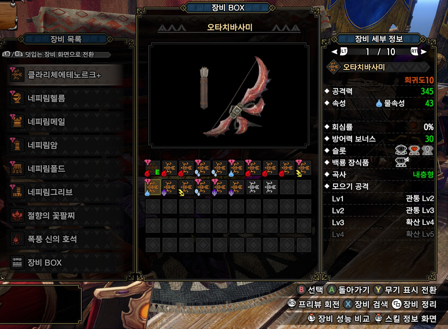 오타치바사미는 D=티카톨에 비해 속성치가 낮지만, 깡공이 높고, 4슬롯이 달려 있습니다. 수속육질이 30이상이면 이옹룡 활이 더 쎌 수도 있을 것 같은데, 훈련장 두꺼비 육질로 테스트를 안해봐서 정확하게 어떤 무기가 더 좋은지는 모르겠습니다(...).